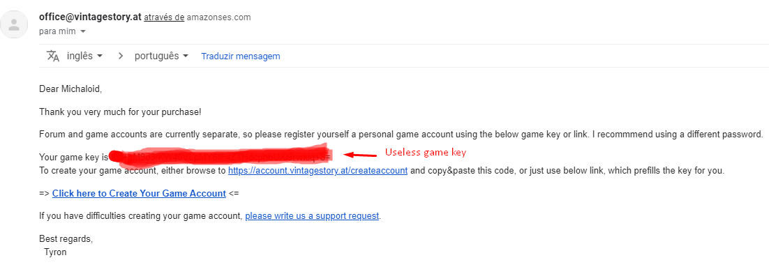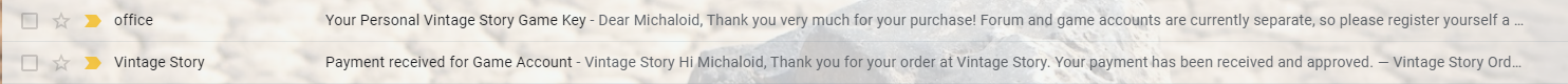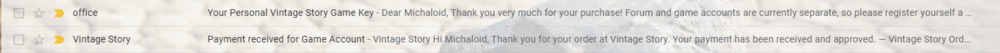 9. After the purchase, you get 2 e-mails, here's mine when i got the game last year. The Vintage story one is your receipt, and the office one is the game key along with the link to the account creation.