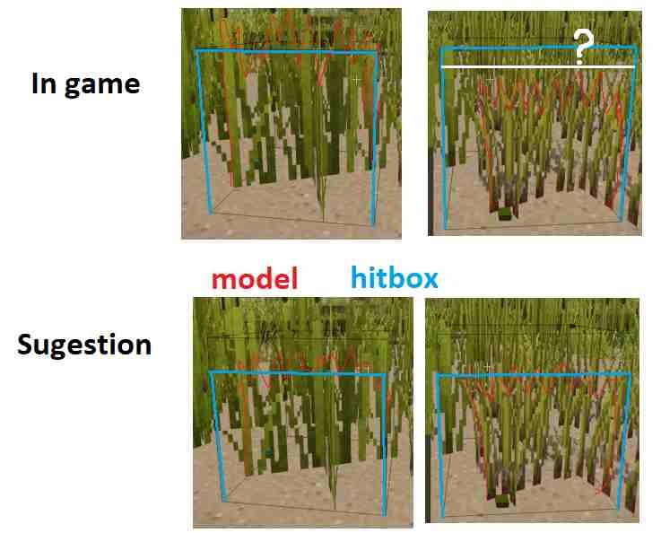 If cuted to half Cooper's Reeds hitbox / model will be 25% lower it will be easier to harvest them (especially with a scythe from reeds field). Same papyrus, they have same full block hitbox ( or maybe 10% lower?), but lower model. Maybe i better explayn my idea on picture: