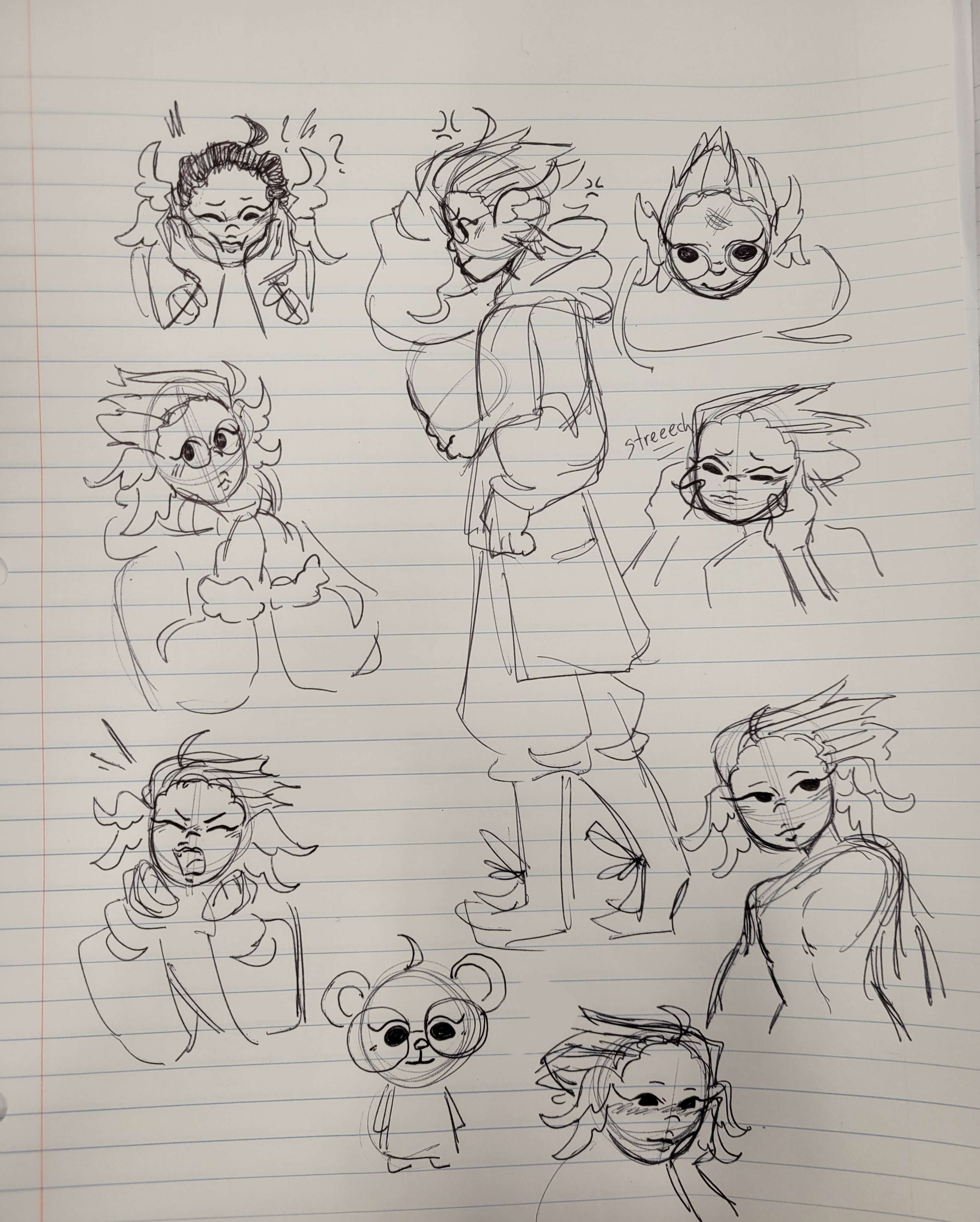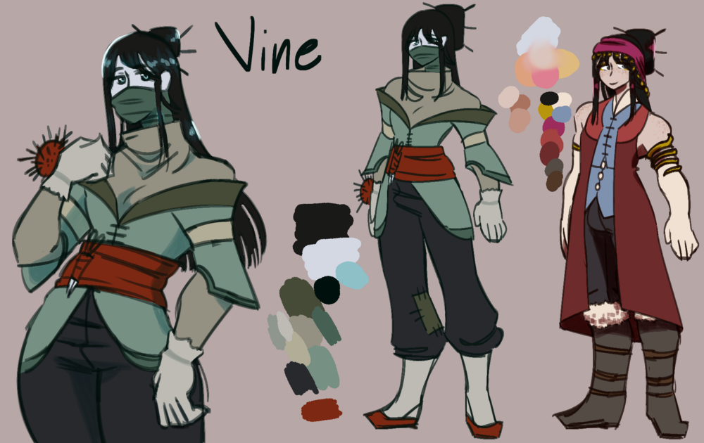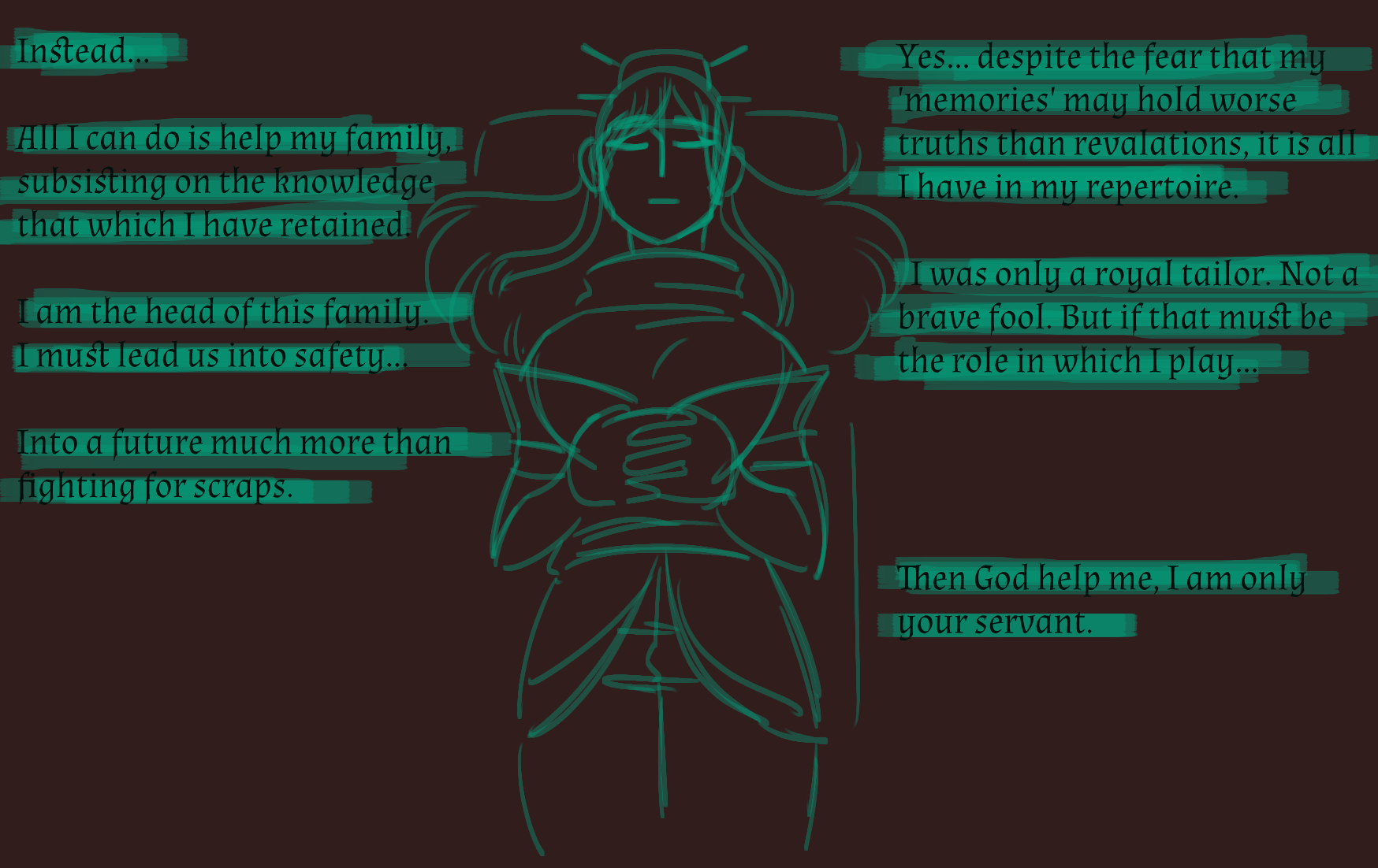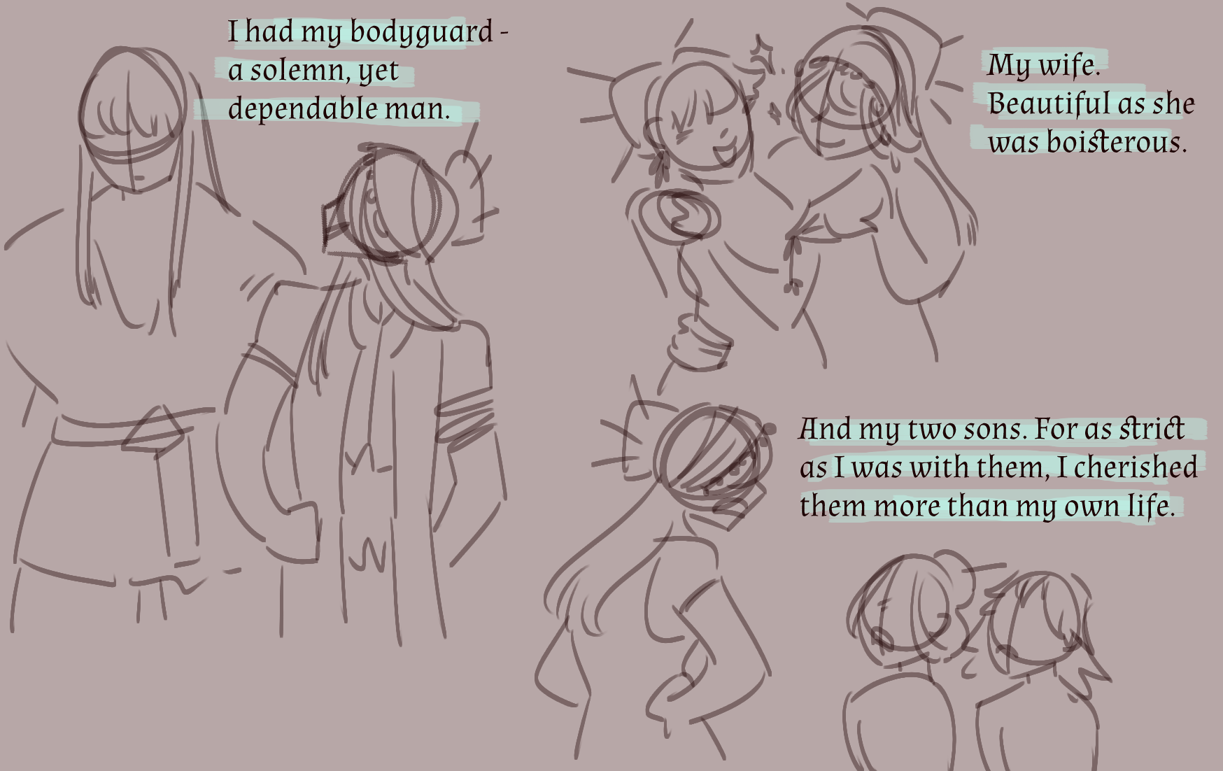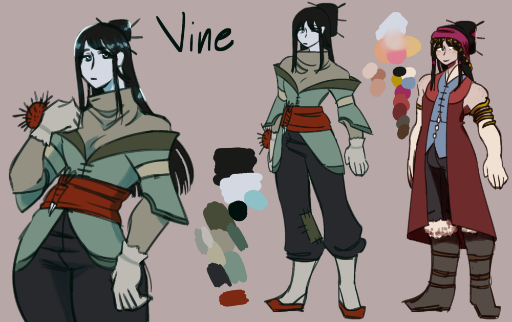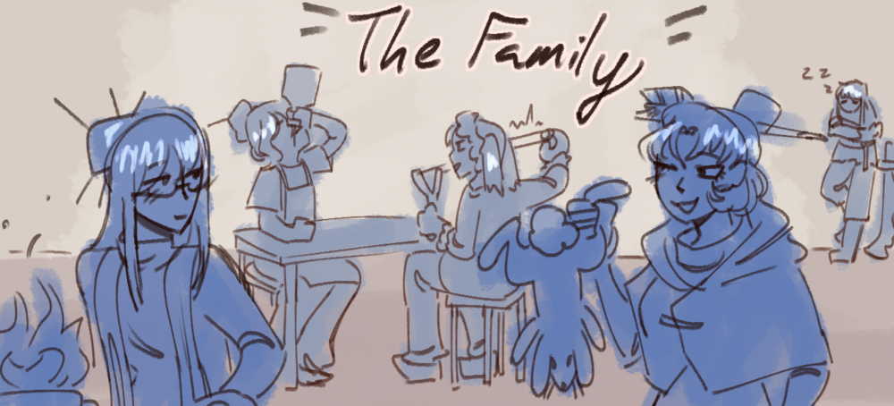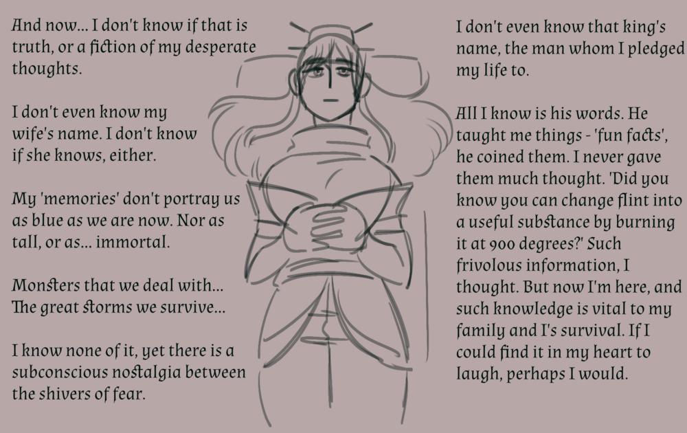 3. After doing a lot of research on the story of. well. you know. vintage story, I started adding in that lore into my private multiplayer server. A lot of my friends are artists, so we'll see if I can convince them to post here too. Either way say hi to Vine!! The father of the family. His name (like the rest of the names of our family of seraphs) isn't his real name, but he doesn't remember what the original was from his previous, human, life. He's a tailor, cook, and a bit emotionless nowadays - but he loves his family terribly despite the circumstances of this strange world they have all awoken in. Next is Vine's wife, Brisket! She's a spunky woman! Neither Vine nor Brisket remember how they met or fell in love, but Vine theorizes it was an 'opposites attract' sort of situation. They aren't too romantic with each other nowadays considering how busy they are at the home, but they always have each other's back. She's the hunter to Vine's cook, always bringing back a huge haul of animals for Vine to butcher and turn into delicious stews and pies. Now for their children. Despite both of the kids having pretty vague genders, Vine just calls them both his sons. First is the older child, who hasn't remembered their name yet nor have they figured out a temp name. Instead, their current nickname is just. 'Miserable Miku'. I'm sure you can see why once you see them. Miku's a bit of a wildcard. They're typically the miner and forager, having been known as a malefactor from before all the family's untimely demise. Apparently Miku spent some time as a blackguard, but how they went from blackguard to malefactor is currently forgotten. They also have a knack for the arts, being the one who chisels the home into shape. And now we have the younger sibling - Petra! The Clockmaker and blacksmith of the family. Compared to their older sibling, Petra is a bit more cheery and interested in their dad's work - after all, Vine and Petra spend the most time at home, one cooking with meat and the other cooking with iron. Despite their sweeter and confident disposition, Petra is still very, very stressed. Being the blacksmith and clockmaker for a whole family means a lot of time building complicated contraptions. They may or may not have picked up a drinking habit. The final 'member' of the family is not really a part at all. Storm is Vine's (and by extension, the rest of the family's) bodyguard. He's a powerful Blackguard, with a mostly stony disposition. Although in their old lives he and Vine had a purely professional relationship, the new situation after becoming Seraphs is more like friends between them now. Oh, and this is where we live! Say thanks to Petra for building the house! Pretty good eye for detail, probably got it from Vine despite his inability to understand architecture. Vine is married to clothes and clothes only - well, and Brisket. And that's it for now! There's a lot more art (and maybe even more characters!) that you'll see, but rn it's good just to get introduced to the players of this story. why, perhaps its even a VINTAGE STOR- (I'm the one who drew Vine and the header. All other art is drawn by my friends in the server!)