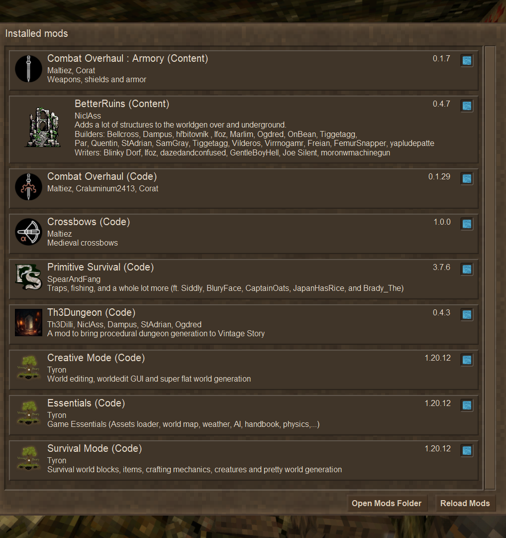 2. My bad the text file is kinda weird, this is the crash log i got Running on 64 bit Windows 10.0.26100.0 with 15713 MB RAM Game Version: v1.20.12 (Stable) 8/23/2025 12:25:05 AM: Critical error occurred Loaded Mods: System.Exception: Coding error: Mods must not get assets before AssetsLoaded stage - do not load assets in a Start() method! at Vintagestory.Client.NoObf.TextureAtlasManager.LoadBitmap(ClientMain game, AssetLocationAndSource textureLoc) in VintagestoryLib\Client\Render\Atlas\TextureAtlasManager.cs:line 841 at Vintagestory.Client.NoObf.TextureAtlasManager.LoadBitmapPixels(ClientMain game, AssetLocationAndSource source, Int32 rot, Int32 alpha, Dictionary`2 cache, Int32& readWidth, Int32& readHeight) in VintagestoryLib\Client\Render\Atlas\TextureAtlasManager.cs:line 792 at Vintagestory.Client.NoObf.TextureAtlasManager.LoadCompositeBitmap(ClientMain game, AssetLocationAndSource compositeTextureLocation, Dictionary`2 cache) in VintagestoryLib\Client\Render\Atlas\TextureAtlasManager.cs:line 712 at Vintagestory.Client.NoObf.TextureAtlasManager.LoadBitmaps(BakedBitmap[] bitmaps) in VintagestoryLib\Client\Render\Atlas\TextureAtlasManager.cs:line 492 at Vintagestory.Client.NoObf.TextureAtlasManager.<>c__DisplayClass58_0.<PopulateTextureAtlassesFromTextures>b__0() in VintagestoryLib\Client\Render\Atlas\TextureAtlasManager.cs:line 446 at Vintagestory.API.Util.AsyncHelper.Multithreaded.OnWorkerThread(Action task) in VintagestoryApi\Util\AsyncHelper.cs:line 52 at Vintagestory.API.Util.AsyncHelper.Multithreaded.<>c__DisplayClass3_0.<StartWorkerThread>b__0() in VintagestoryApi\Util\AsyncHelper.cs:line 44 at Vintagestory.API.Common.TyronThreadPool.<>c__DisplayClass13_0.<QueueTask>b__0(Object a) in VintagestoryApi\Common\TyronThreadPool.cs:line 122 at System.Threading.QueueUserWorkItemCallback.Execute() at System.Threading.ThreadPoolWorkQueue.Dispatch() at System.Threading.PortableThreadPool.WorkerThread.WorkerThreadStart() Event Log entries for Vintagestory.exe, the latest 3 ================================== { TimeGenerated = 8/23/2025 12:00:25 AM, Site = , Source = Application Error, Message = Faulting application name: Vintagestory.exe, version: 1.20.12.0, time stamp: 0x66470000 Faulting module name: coreclr.dll, version: 7.0.1023.36312, time stamp: 0x64b06d6c Exception code: 0xc0000005 Fault offset: 0x00000000001c98a6 Faulting process id: 0x11f68 Faulting application start time: 0x1dc13e2546f9a1b Faulting application path: D:\Vintagestory\Vintagestory.exe Faulting module path: C:\Program Files\dotnet\shared\Microsoft.NETCore.App\7.0.10\coreclr.dll Report Id: e24b7c60-93d1-4d62-b95f-36f4c8d00c53 Faulting package full name: Faulting package-relative application ID: } -------------- { TimeGenerated = 8/22/2025 11:59:04 PM, Site = , Source = Application Error, Message = Faulting application name: Vintagestory.exe, version: 1.20.12.0, time stamp: 0x66470000 Faulting module name: coreclr.dll, version: 7.0.1023.36312, time stamp: 0x64b06d6c Exception code: 0xc0000005 Fault offset: 0x00000000001c98a6 Faulting process id: 0xb604 Faulting application start time: 0x1dc13e230f98eb2 Faulting application path: D:\Vintagestory\Vintagestory.exe Faulting module path: C:\Program Files\dotnet\shared\Microsoft.NETCore.App\7.0.10\coreclr.dll Report Id: cc4a5f69-e928-44b1-9b68-a58476bdd78b Faulting package full name: Faulting package-relative application ID: } -------------- { TimeGenerated = 8/22/2025 11:58:25 PM, Site = , Source = Application Error, Message = Faulting application name: Vintagestory.exe, version: 1.20.12.0, time stamp: 0x66470000 Faulting module name: nvapi64.dll, version: 32.0.15.8088, time stamp: 0x6885c44f Exception code: 0xc0000005 Fault offset: 0x00000000002c17c9 Faulting process id: 0x117e0 Faulting application start time: 0x1dc13e2074d2795 Faulting application path: D:\Vintagestory\Vintagestory.exe Faulting module path: C:\WINDOWS\SYSTEM32\nvapi64.dll Report Id: 880768fb-0fa9-4f0b-9d71-65c5b1366f7b Faulting package full name: Faulting package-relative application ID: }