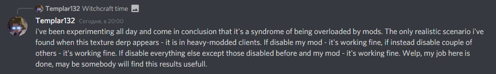 Fun part is that i cannot even launch all of these mods simultaneously, cuz i have not enough RAM(8GB), huh. So that's probably a heavy pack to me. Can you send here a crash log? I'm not a telepath, its hard to guess. In addition to my experiments results - there was a situation when i'm was unable to load a world with my mod, Bricklayers, Primitive survival and The Neighbors installed simultaneously. Disable ANY of them - it works fine and no strange colormap crush (under spoiler), and the weirdest part - add just more mods and there is no crush too. wut. In conclusion - I suppose its some colomap derpiness thats brings thats weird block render due to overload by mods (maybe this connected with block id problem?). My mod _itself_ have no connection to it just because the only things it changes in vanilla - it is plaster blocks, other stuff it adds like a content mod, so its just brakes a camel back. Code part just brings some block classes, so no connection ether. Oh, forgot to show a screenshot of reproduced stuff: -