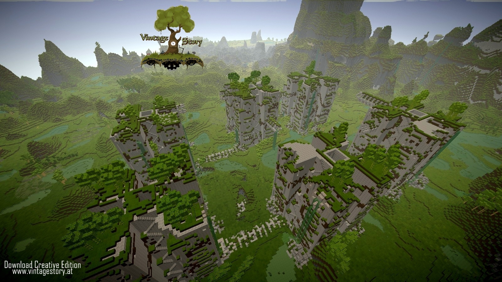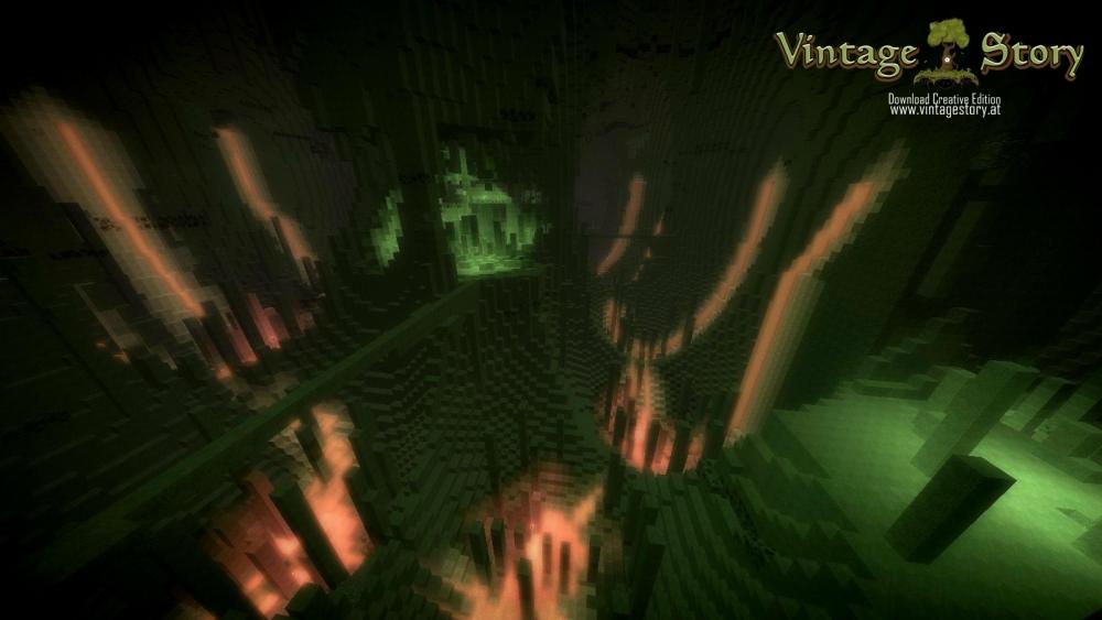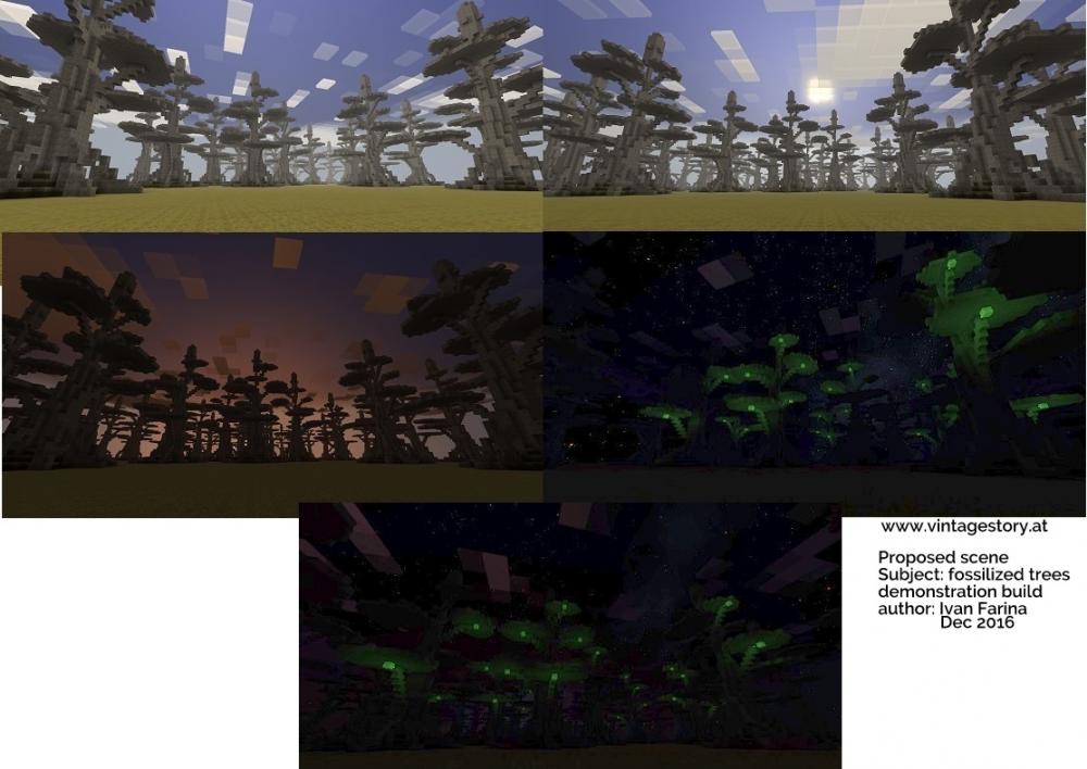 16. Inspired by the movie 'The land that time forgot', this test build was created in an early version of Vintage story, to test how much scenery can be handled by a low powered Nvidia graphics card (ie my one!). Since it was built the engine has dramatically improved, so I will get back to it at some stage in the near future. As can be seen the hill top town is incomplete, with a few gaps here and there. As I said, I do intend to return to this scene, but with the extra intention of also creating a city that is about 20 times the size. Preliminary builds have been done of this, and the scale that it is possible to work with using the Vintage Story engine is staggering. In this early version. using an AMD E1 processor, a view distance of 660 was possible. I look forward to seeing how much more can be done now that the VS engine has been improved even further. The land in the lowlands beyond the town is an 'Acid Swamp', which I developed when testing designs for fossilized trees. 1 Town and scwamp 2. + 3 'Acid Swap' by day and night 4. Fossilized tree before I added the extended roots and split level landscape. 5 . Treescape with figure to show scale.