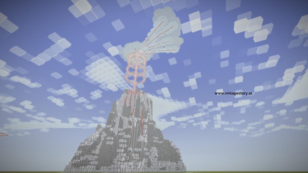 My second attempt at an erupting Volcano. Embers rather than Lava is used to create the comic book style eruption plume, and bloom is set to about 80% to make it glow. The height is about 250 blocks. The plumes cloud is made from a mixture of lake and glacier ice to create a transparency. In my first attempt I used a mixture of dark creative blocks flecked with red torches, and that approach worked better.