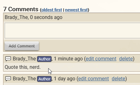 It's a bit of a cheat. While you have very limited styling capabilities in the comment editor, compared to the mod description editor, the comment section gladly takes any copied styling properties and displays them properly. You simply highlight the comment you want to quote, right-click on the selection and hit copy, or press Ctrl+C, then you write your comment and hit Ctrl+V wherever you want the quote to appear. As long as it's the mod author you are quoting, that author should be notified about the comment. If it is somebody else, I don't know, haven’t had the opportunity yet to test it (I somewhat doubt it, though). Edit: I posted two test comments. One just copied, another one slightly edited with an @mention. The latter should definitely theoretically notify you. Btw, really nice mod you released!