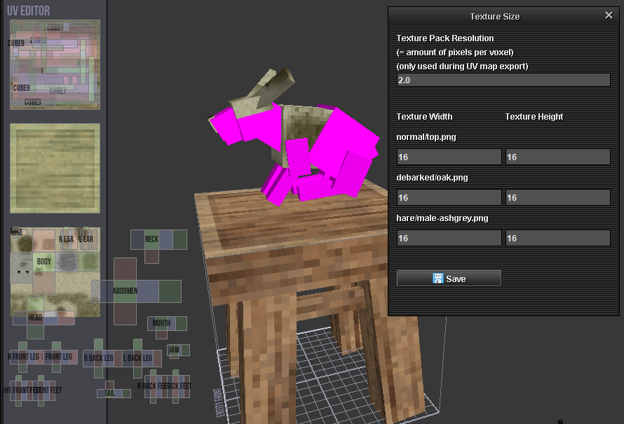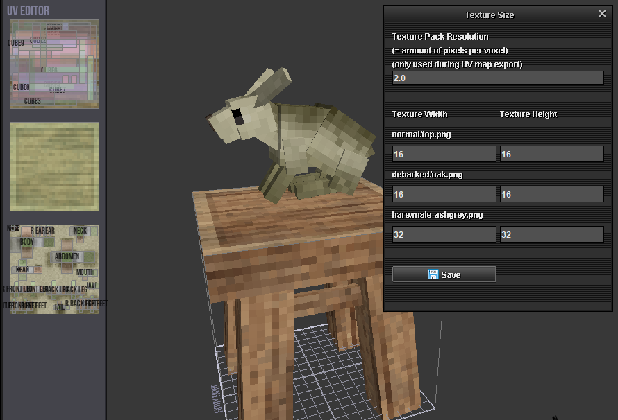 I figured out your problem. You probably imported the rabbit after opening or creating another shape which has its texture size set to (most likely) 16. The hare in your example has its texture size set to 32. This leads to the texture size of the rabbit being adjusted to the size of the original shape and to the misaligned mapping you experienced. Changing the texture size of the hare (or any other shape with this problem) to its appropriate size via Project > Texture Size should fix this problem. 32x32 should be the max size for any Vanilla shapes you use, but to make sure, you can simply open any shape with a text and code editor of your choice and check sizes:
