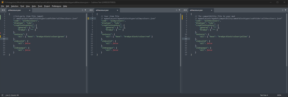 10. That's Compatibility Lib's moment to shine. I am currently rewriting the article, because it is a bit archaic. Here's a sneak preview: https://wiki.vintagestory.at/BradyThe/Sandbox (It's still a work in progress, but hopefully explains the inner workings of the Comp Lib already a bit better.) How I would go about it depends a bit on the structure of the other mod and your goals. Remove recipes from the other mod: Easy. I would probably use Mod-dependent json-patches (JSON Patches in my rewrite) to disable them. Combine/replace item: Easy - medium: There are one or two solutions to this. Overwrite the 3rd-party item with the Comp Lib. Put all properties of both items (the 3rd-party and yours - combine) into this file. Disable your item via patch. Add recipes into the compatibility folder using the item code of the overwrite. Disable the 3rd-party item with a patch, add any properties of the 3rd-party item you want in yours (combine) to your item by patch. Example setup (I quickly frankensteined an existing test setup, pay no regard to any domain or other inconsistencies): I hope all of this isn't too theoretical only making sense in my mind. If you have any questions, shoot them.