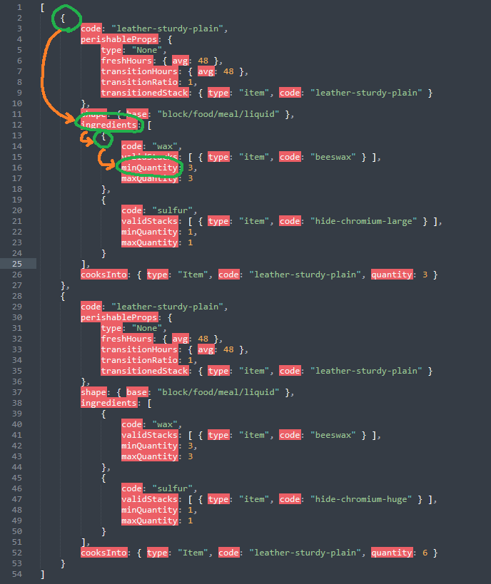 This happens because you are trying to add your moustache to an array (square brackets) with the wrong value contents (curly braces). I've not dabbled in hair, but I did help somebody a bit a while ago. I adapted their solution to your parameters. See if [ { "file": "game:entities/humanoid/player.json", "path": "/attributes/skinnableParts/8/variants", "op": "addmerge", "value": [ { "type": "shape", "code": "mst-typical01-skinny", "shape": { "base": "expandedhairs:shapes/entity/humanoid/seraphskinparts/hair-face" } } ], "side": "server" } ] does the trick. -