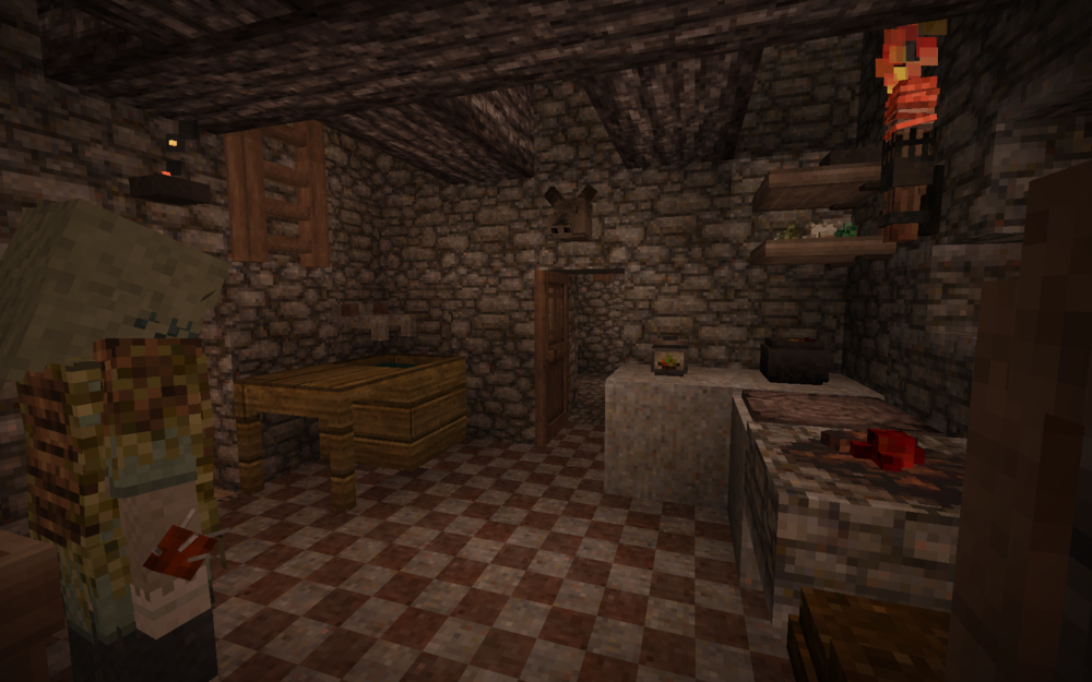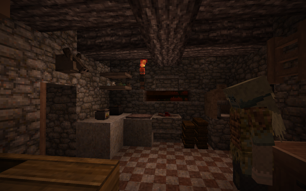 Our kitchen so far! We just made it to the copper age. It has an oven, stove, counter space, and a sink. Plus storage in the support beams--lots of chests and reed baskets, all accessible via the two ladders in the kitchen. Really loving the overhead storage so far.