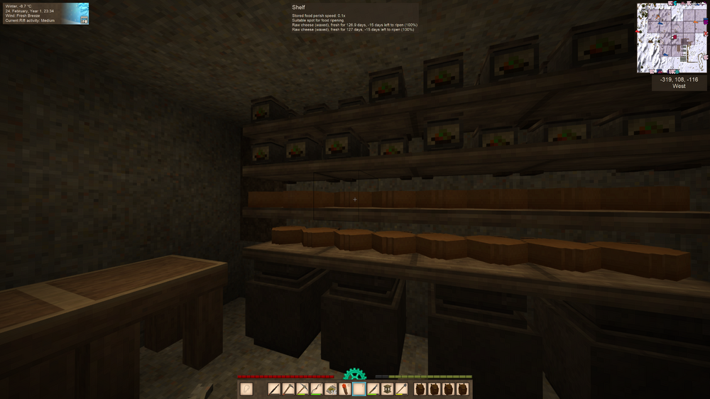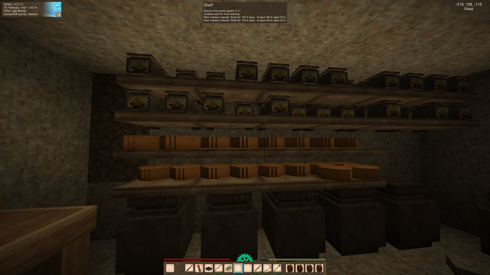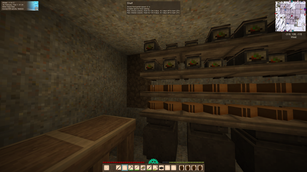 4. Hi, I did some more testing and I think there might be several issues: 1. Looking at the link cheese-making video from PapaCheddar on the VS wiki there appears to be a change (or introduced bug) in 1.18.15 (stable). In the video (from 2 years ago), as soon as he put the raw-cheese (waxed) on the shelf it displays 'Will ripen in 0 hours' then immediately shows '19.6 days left to ripen (0%).' The countdown is displayed in the 2nd text. In 1.18.15, the display starts with 'Will ripen in x hours' and STAYS there until the countdown reaches 0 THEN it displays 'x.x days left to ripen (0%)' with a continued countdown. Perhaps the countdown is supposed to show in the second text like in the video. 2. After 'Will ripen in 0 hours' ends it starts with '-8 days left to ripen (0%)' and the % increases from there. It should not display negative numbers. I forgot to mention I use 30 days so the cheese's '14 - 20' days to ripen might have been based on 9 day month (default). So days to ripe should be more if it follows the same logic as farm growth times changing if you change your days / month. I don't know if 14-20 days is a constant value no matter your month setting. Did you change your days per month setting as I did? Mine is set to 30.