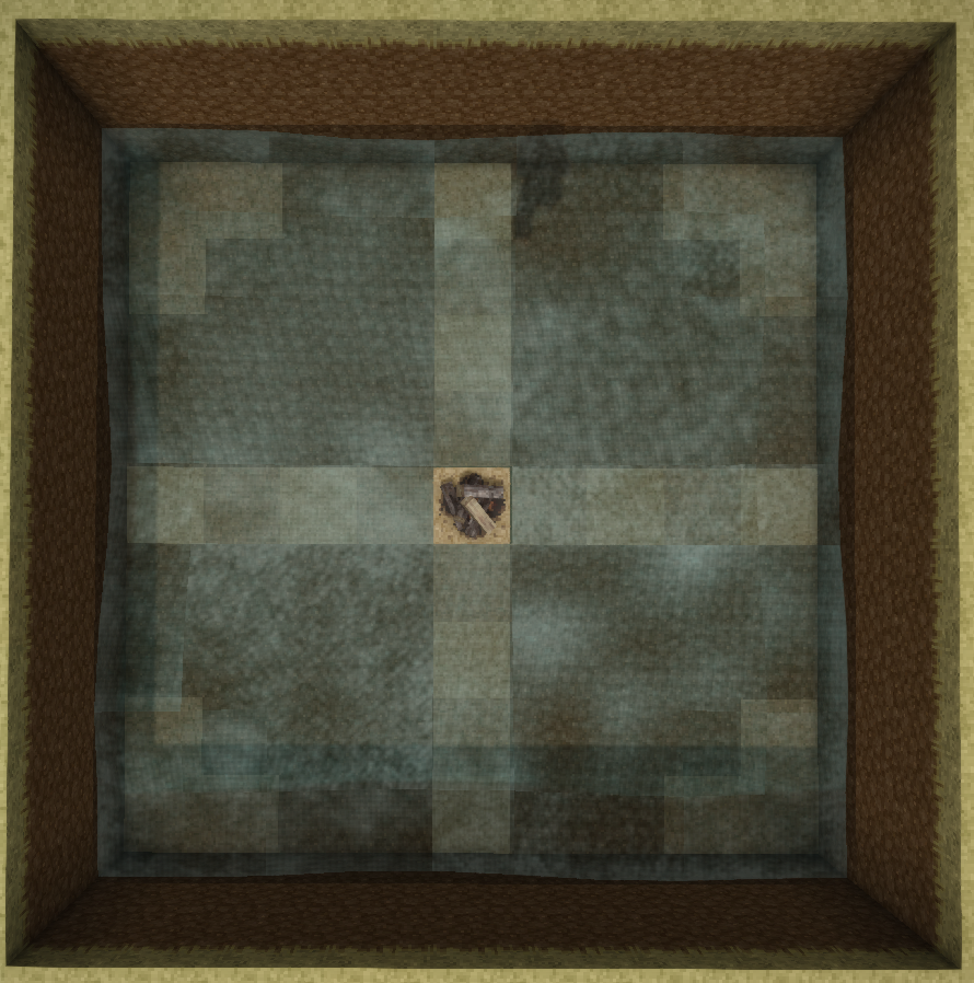 7. First, dig a 9*9*3 hole. (The packed dirt is used to showcase it better) Then, build a firepit in the middle. Afterwards, place water on the marked spots in the corners. So these are the first three steps. How do u like it?