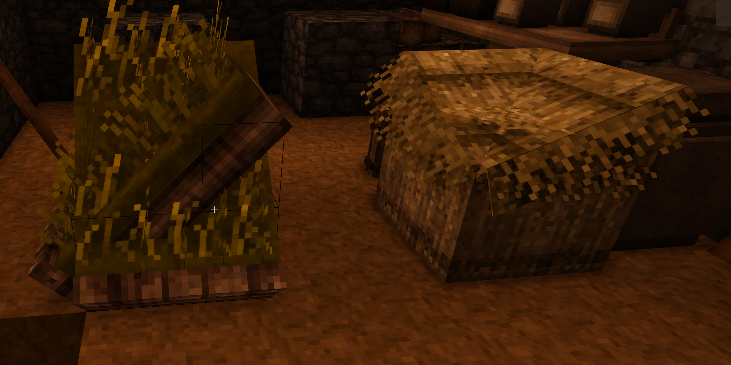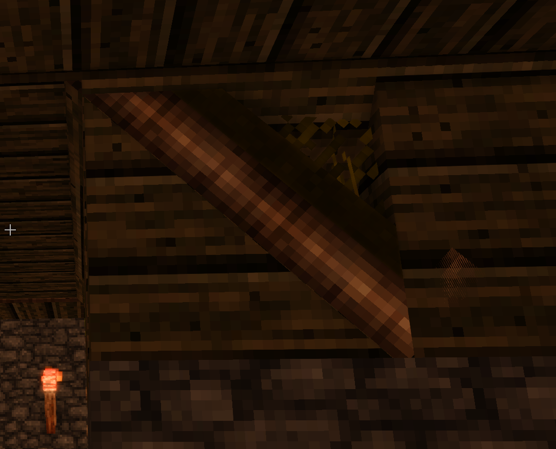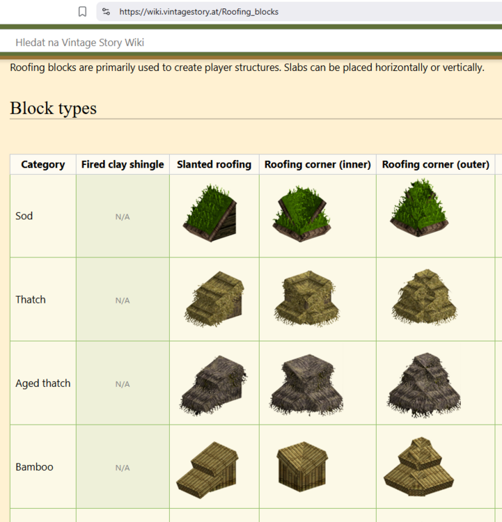 2. While trying to build a sod roof, I noticed a flickering texture of the Sod roofing corner (inner) model (this flickering has occured a few times with overlapping models such as pelts placed on the floor). Pic 1 shows the Sod roofing corner (inner), the flicker occurs on the right side. Because of this, I noticed that the Sod roofing corner (inner) block has a weird shape. It just looks like two normal slanted sod roof blocks overlapping each other. So I googled, and to my surprise, the Sod roofing corner (inner) block on the wiki looks bugged the exact same way. Seems weird, but maybe it's not a bug? Then I noticed the picture of the Thatch roofing corner (inner) just below. This pic has the exact same problem, as the sod corner block - two normal roof blocks occupying the same space. But the weird thing is, that in my game, the thatch roof corner (inner) looks okay - like an inner corner would. Aaaand the Bamboo roofing corner (inner) looks right. Ingame, the Thatch roofing corner (inner) looks right, unlike on the wiki: I haven't found any reddit post, forum posts or an open issue in the issue tracker about this. Initially, I thought about reporting it as a bug, but the wiki shows the weird models, which makes me think that it may not be a bug, but a WIP of some of the roofing blocks. That's why I''m posting this as a question first. Does anyone know, why is there this weird discrepancy between the two roof models? And why the wiki shows both of them either bugged or outdated, even though only one of them looks like this ingame? I'm playing on 1.20.9 (stable) and have 4 mods: BetterRuins, Carry On and Player Corpse with its library CommonLib. Sorry about the huge ass screenshots.