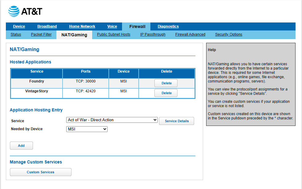 Evening, Just got the game a few days ago after a friend suggested it and i tried to port forward the game so we could both play together. Ive open my firewall ( i think. windows firewall) and port forwarded on my router but when they try to join my game nothing happens. to my knowledge my router dosnt have upnp (AT&T BGW320-500). If anyone has any tips im all ears