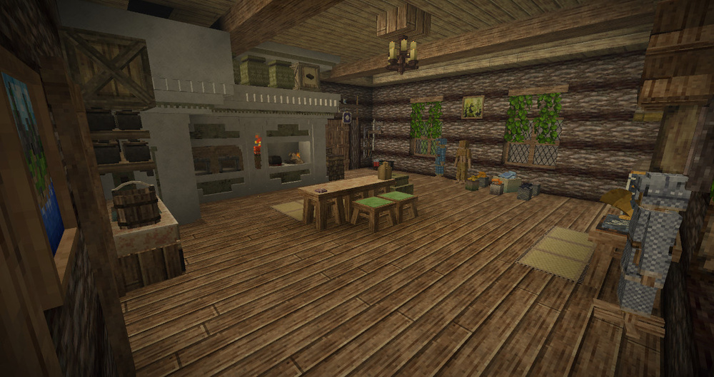 Another series of screenshots from the ship's kitchen. The ship is a collaborative effort among our server's players, and I want to show off my part of the work. 1, 2. Sideboard. Pots and bowls are stored there. 3, 4, 5. Stove. You can cook inside. 6, 7. Kitchen cabinets and sink. You can wash dishes and get water in the sink. The cabinets above are decorative; the round wooden plates were made by another player. The mosaic floor is mine.