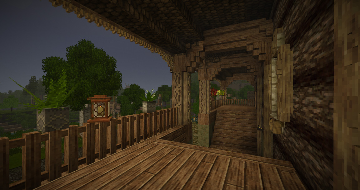 A chimney (possibly decorative), small dormers, and flower boxes for the exterior windows. A large porch could be added to the main entrance. A large terrace with a tiled roof, potted plants, lanterns, carved benches, and tea tables could be added to the ground floor.