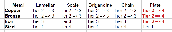 Plate armor at lower tiers seems to be an absolute waste of time and resources. In my first game I've created a bronze plate set and not only was the defense lackluster, but it also ended up being shredded in no time. From experience you'll encounter T4 enemies quite early on just via temporal storms or doing a deep dive in a cave. It would be nice having the option to do a more safe deep dive, albeit at the expense of armor being wrecked. As, from my understanding, durability loss depends on f(Tattack, Tdefense, ?), so a durability reduction will most likely be necessary. Might even be as simple as Steel x hits, Iron x/2 hits, Bronze x/4 hits, Copper x/5 hits at say max damage. This might also help in extending the bronze age most people seem to try and skip completely. Unless the lower tier plate armor gets and update, I honestly don't see any point in crafting it for defensive reasons. Just grabbed the table via AI.