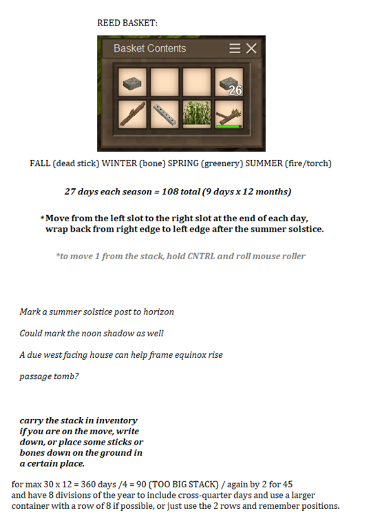 That is amazing and dedicated work you did to make your observations! I also made many in-depth observations since I've started playing. The movement of the sun on the horizon and its changing rise/set angle per latitude were one of the main reasons I was attracted to Vintage Story as I always wanted to play in a world where I could track time in the sky like the ancients. Archaeoastronomy is my scientific specialty. I even arrange my stats window to cover the date and the time. I set up horizon marker posts and watch shadows as well. I mark the sun on the meridian to see when I get to mid-day and it always keeps me oriented. I love the glass dome ideas, but I'm playing only in the stone age for now, so I have to keep things very primitive. Sadly even chiseling needs metal tools for some reason. I track the days by keeping a pile of stones in a reed chest with items representing winter, spring, summer, and fall. When the sun is setting due west at one of the equinoxes I start the count and transfer one stone from the pile toward the next section until they are all moved, them I'm at the solstice, repeat to the next equinox and the other solstice and then move back to the starting equinox. I too noticed the stars didn't change with latitude when I first started playing and the moon phases were very confusing since it wasn't illuminated by where it was positioned in relation tot he sun and always followed the exact same path in the sky instead of shifting along the ecliptic like the sun. When the release notes for the most recent update came out I was super excited and the moon changes are a great improvement. The stars now progress over the year (in the opposite direction as on Earth, but hey, maybe this planet is in a retrograde orbit) but although the update was planning to have the stars change appropriately to the change in latitude, it did not work, so hopefully that can get fixed. Here is a link to a post where I detailed what seems to be the current issue with the stars: -