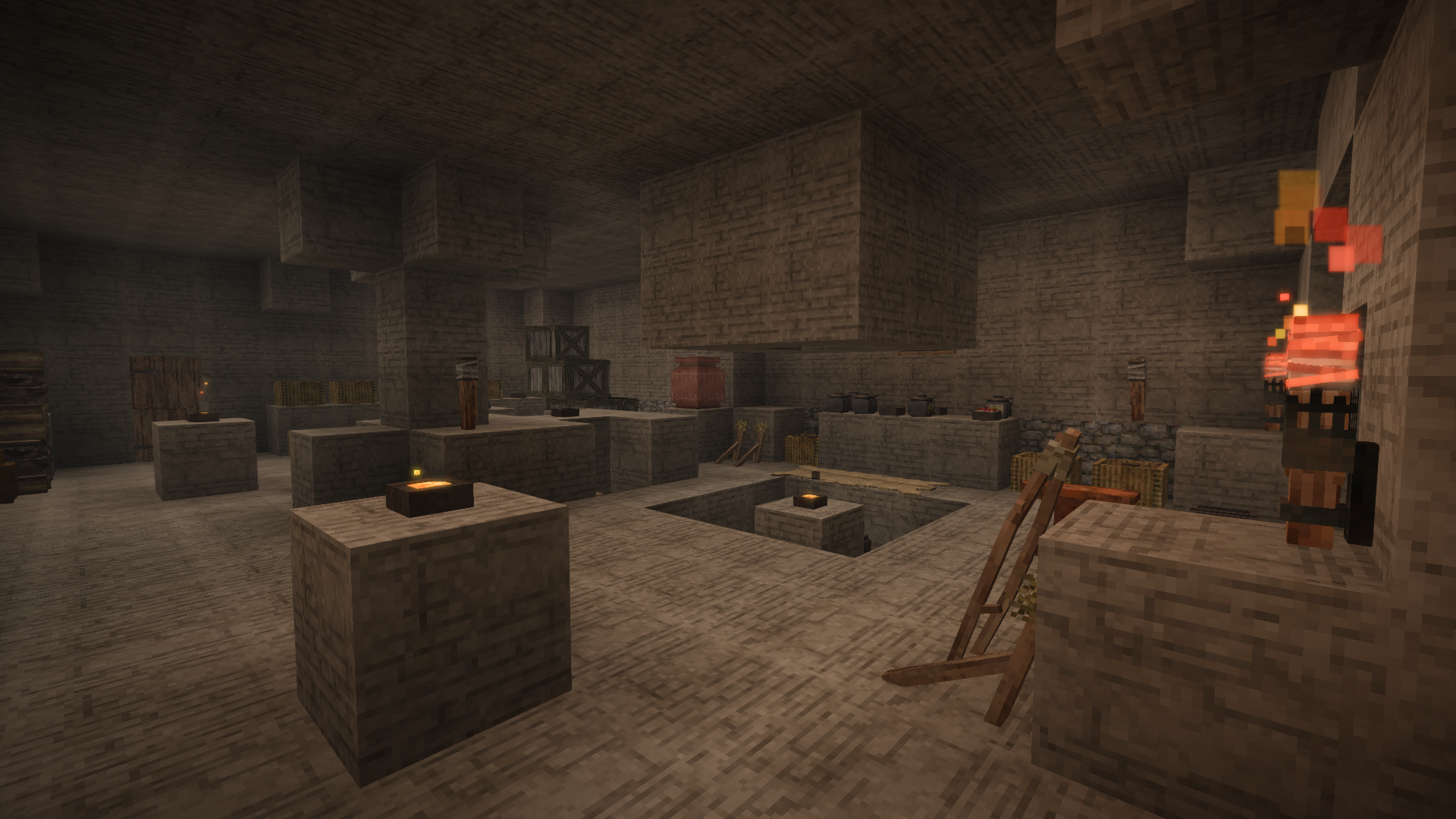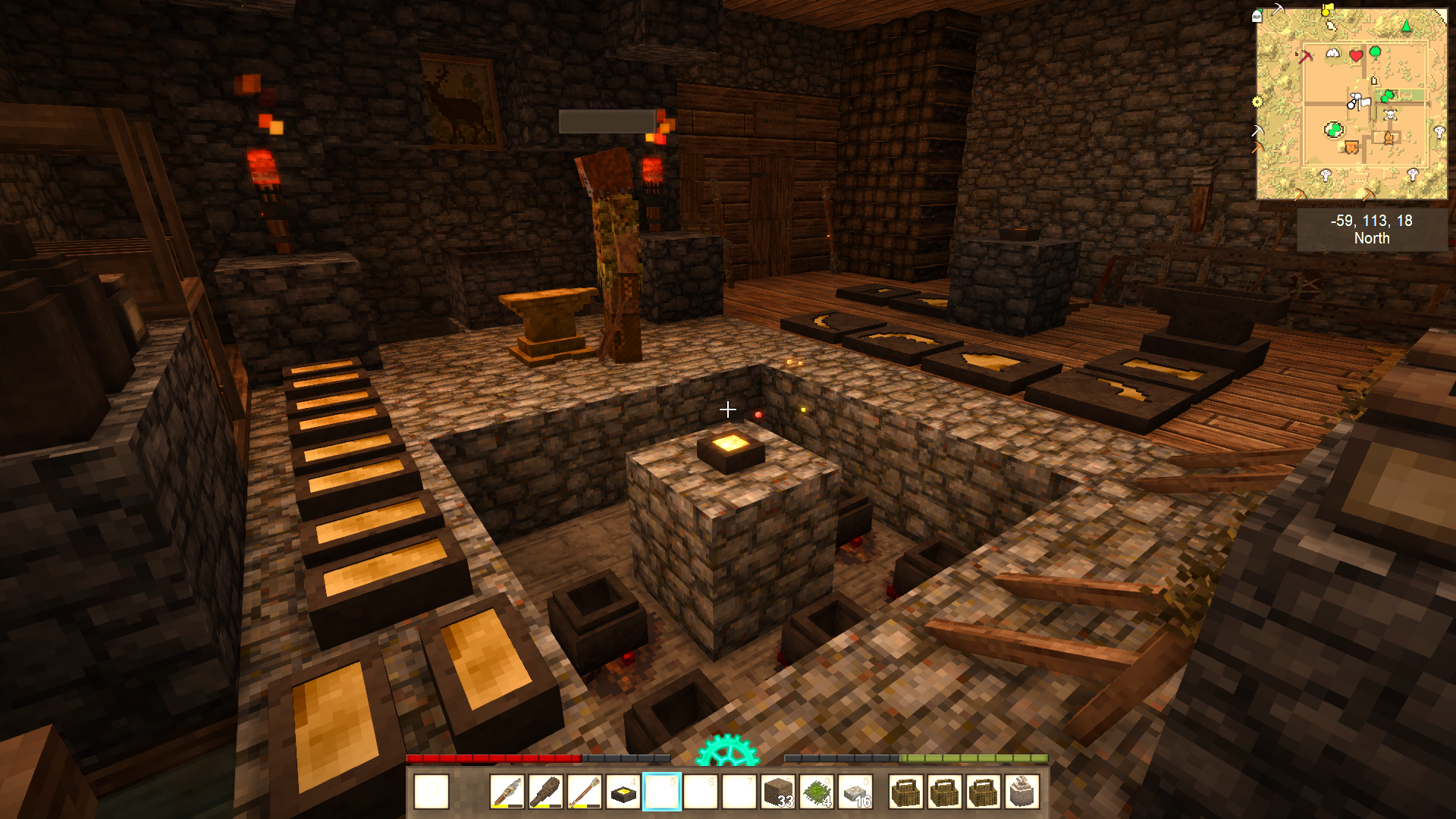 This is the first world I wintered through. I'm in November of my second winter now. I played this on and off with a friend who bought the game a day after I did. We had been talking about buying it and we're both fans of creative games and roguelike and other challenging games. I've also played this in VR with Virtual Desktop. In this pic, I was playing VS in a virtual environment...ironically while playing it on a laptop. Usually, I play it with a giant curved screen that makes you feel like you're inside the game. Even though I had a little practice, I still had a rough start. Instead of preparing for my first winter, I scouted out a spot, then marked out an 81x81 area. I dug up a mountain of dirt to flatten it and then a few more mountains to create a wall and a manor out of rammed earth while starving to death repeatedly. My friend popped on and started helping out with clay and tool making. This was just before my first winter. We lived off of scraps during the first winter. Now, here I am during my second winter. I've got Sasha, a furniture trader who keeps trying to sell me wallpaper, pottery kiln, charcoal kiln, ground shed/cellar, drifter traps, crops, fruit trees, animal pens (chickens and boars), a pond full of cattails behind the manor, and a fairly dangerous vertical cave mouth crawling with baddies at the bottom that I've put a little wall around. Also, I'm working on finishing the third floor/roof now. On the inside, I've got a cooking/smithing area, two personal rooms, storage, an underground cellar with three rooms at the moment, food storage, fruit press with juice/wine storage, and a room for curing pelts. I'm just starting to move overflow storage and additional processing equipment (oven/grinder/etc.) to the second floor. I messed up by planting flax under my 2F deck, so I had to temporarily remove a portion of it. I walked a long way with that collapsed chest, only to realize once I got it back home that it was unusable. I was fortunate to find a wall full of aged crates from surface dives near my base. Not-So-ProTip: You can lean tongs against a single block as long as there's a one-block tool next to it. I went from starving last winter, and now I've got over 100L of cranberry wine and then some. I've got nearly a full chest of grain, full chest of various veg, and one and a half chests of mushrooms. Gonna be cooking up porridge and getting drunk on cranberry wine. I have some very basic drifter pits. I still have to reconfigure them, but they've yielded a decent amount of flax, temp and rust gears. I've found numerous quartz deposits but haven't had time to mine them for windows yet. You can't tell from the pics, but a third of the roof is done. I'll need a butt-ton more shale to finish it. It's still more economical than clay shingles at the moment. I'm thinking about converting the crops into one long, sectioned greenhouse. Also, the detailing, chiseling, and more advanced interior decoration, I'm leaving for later game. I started out the wall, manor, and additional floors in rammed earth, and I've just been upgrading as I go. I've been doing a lot of exploring and I've ravenously waypointed just about everything I can, veges, trees, ores, POIs, and other resources, including every cave entrance/hole in the ground I come across. I've found three translocators already near me with some light surface diving and activated one. When, we had been in the copper age long enough, my friend says we need tin, and I already had it marked and prospected. I previously prospected out a spot where I got a bunch of copper from and got a very great hit on tin, too. My friend has done a lot of mining, smithing, hunting, and deep cave diving, while I've been largely focused on building, collecting resources for the manor, and keeping us both stocked with tools and adventuring gear. My friend uses more valuable gear while I burn through donkloads of tools. He did lose some valuable tin bronze mining gear, falx, and other stuff (I hate replacing dishware!), but I've burned through donkloads of tools on terraforming and building. Right now, it really hurts losing those linen bags, though, because I only have a handful of flax seeds and messed up the second harvest a bit. (VS: Better with Buds Edition) I've started doing exploratory dives with little to no gear to scout for ores, danger, section off areas if I can, etc. then planning to go back later with better gear. We don't have much in the way of decent armor, and I know even with top tier gear, we can't just faceroll the depths the way you can make yourself essentially invincible in MC. I'm going to be doing more exploratory dives to search for ruins and ores and determine if a cave is worth risking good gear on. I'm getting the hang of mining now. It reminds me a bit of Firefall (RIP) and Project Entropia (a soulless moneypit). Before my first winter, I kept looking at the ceiling stacks of firewood I had collected and thinking that I'm going to need more for the winter. Every time, I'd take firewood, I'd be like, I'm gonna need more for the winter. Finally, I realized it was already winter. Same thing this winter. It's November now and I was just thinking I was going to need more firewood for winter. When I started, I focused on terraforming, building the base of the house, and collecting resources while starving to death repeatedly. Near the end of my first winter when I started finding more food, instead of eating it as soon as I got it, I starved to death, died, and stocked up the cellar until the end-end of the winter. Sure, it's kinda cheese but VS doesn't really make me feel bad for getting that little bit over it. Anyway, I'm immortal, right? I enjoy playing mostly vanilla survival in games like this. I've got a few mods that I feel are in keeping with the vanilla spirit: QP chisel tools, Carry on, more icons, and shared waypoints since I'm playing with a pal. I'm also playing with 70 or 80% landcover for oceans, can't