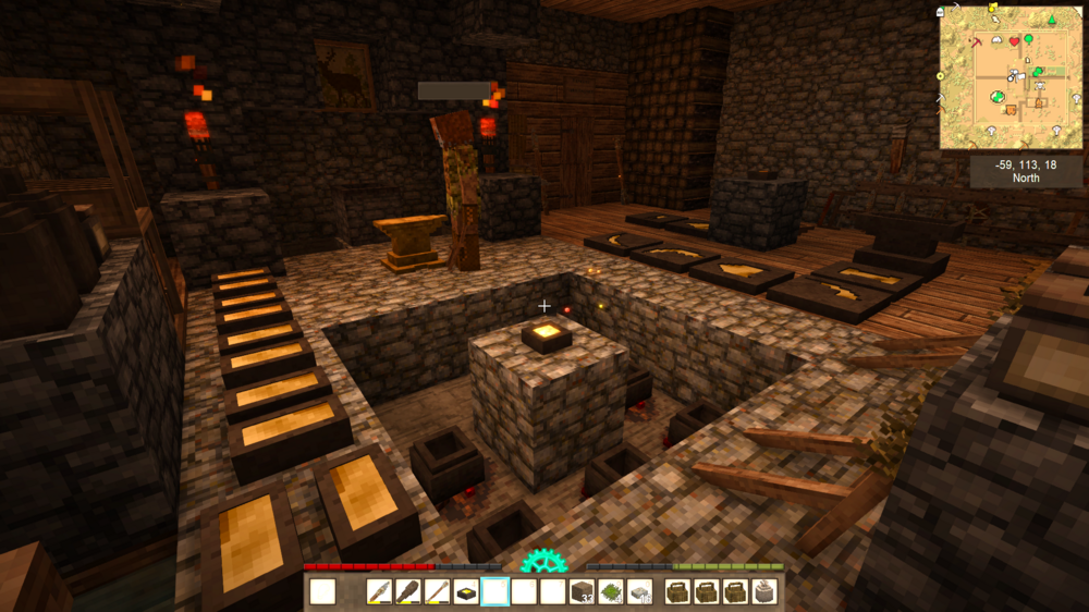 Post 100 hours update: Shortly after posting this, we struck multiple veins of iron and silver and began processing it, too. Still on my/our second winter. So we had a massively slow start (mostly because I initially focused on future planning/build design/mass terraforming) followed by rolling down the hill. I also got a bunch of quartz which is very easy to find and made basic windows which I'll upgrade later. We made a lantern. At last...proper-ish lighting! I streamlined the first floor, converted one room into a shared quarters, and turned the other into a staircase to the second floor. For the second floor, I added some spaces for processing, cooking, and a super forge. We found various rocks and stuff and now we've got barrels of various mixtures. The idea is that we use the second floor for more involved resource processing and additional storage, and the first floor for simple, expedient stuff. I'll probably add a warehouse to the cellar at some point for bulk storage once we need it. After I finish the roof, we might use that as a personal space. It's still not fancy because I'm saving furnishing/decoration, and interior/exterior chiseling and flair for when I've got all the walls, windows, and a completed roof. Since I'm still moving things around, it's easier to use simple block interiors for now. So, just to be clear, I'm not showing this off as an example of build/deco expertise. Not yet, anyway.- 1 reply