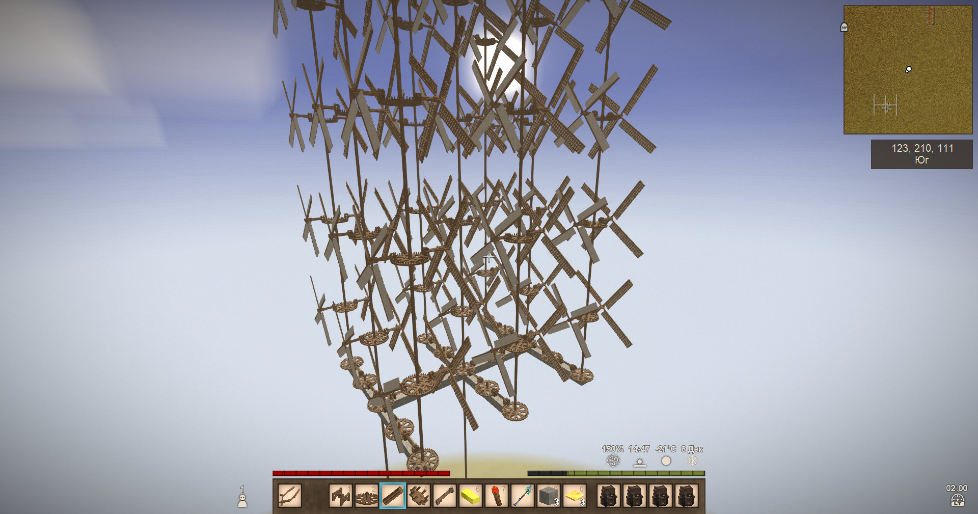 1. Vintagestory2025.09.08-02.09.44.03-ezgif.com-crop-video.mp4 It's working in pulses. From what I understand, at high speeds, the hammer requires a massive amount of torque. To generate this torque, the windmills reduce their speed. Because the windmills have slowed down, the hammer also slows down, and now it doesn't need so much torque. This causes the windmills to speed back up, which in turn means the hammer requires high torque again. This definitely seems like some kind of bug