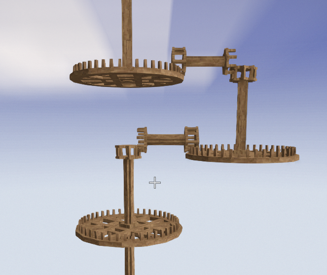2. I decided to run some tests, and it turns out that everything works like in real life: the lower the sail speed, the higher the torque, and the higher the speed, the lower the torque. That's why they slow down.But in that case, I don't understand why in my other system, 72 windmills can't provide enough power to run 1 helve hammer at x9 speed (the gearing setup is the same as in the screenshot above).Through testing, I found that 1 windmill can sustain 1 helve hammer at 1/3 speed (even with 50% wind) using one large gear for speed reduction.This should mean that 3 windmills could run the same hammer at x1 speed (one gear for reduction, one for speed-up).Which means 9 windmills should run it at x3 speed (one reduction, two for speed-up).And 27 windmills should be enough for x9 speed (one reduction, three for speed-up).However, I have almost three times that many windmills (72), and the wind is at 150%. This should theoretically be enough for x27 speed (one reduction, four for speed-up), but for some reason, the system stalls even at x9 speed.