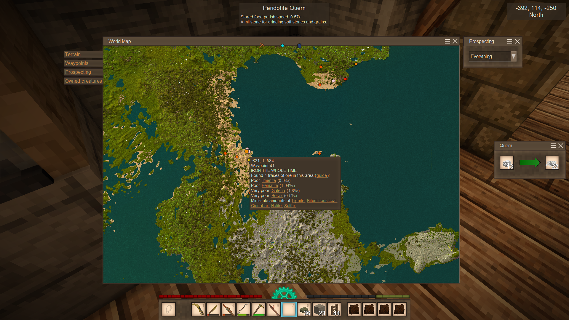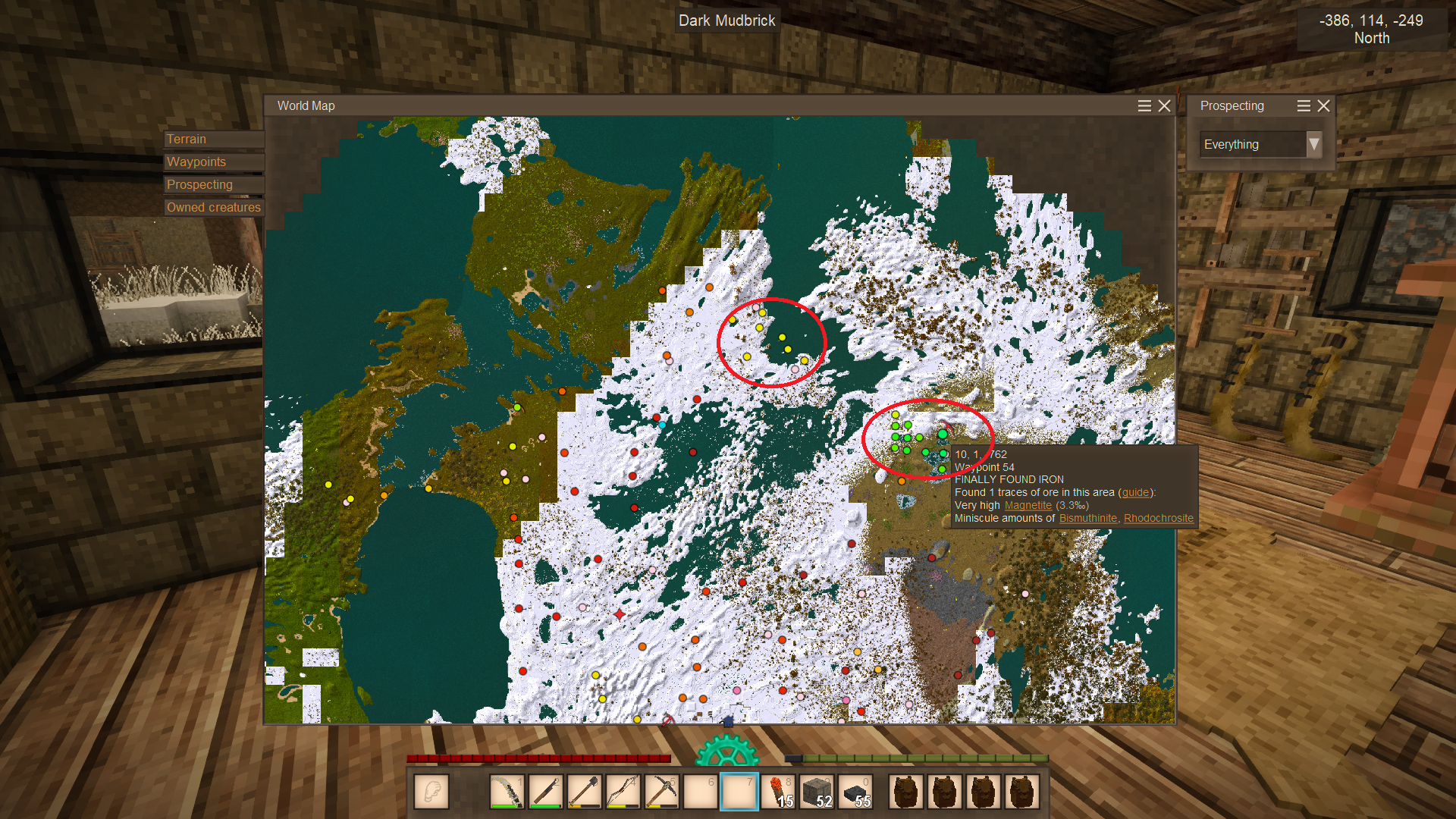 Followup on the nature of my luck as I kept the old save file and went back to it. I dug directly below the only borax mine I had mentioned in this post only to find a bountiful Hematite mine(Yes, likely everything is under that really huge body of water, theres also "decent" hematite on the exact polar opposite of that water but the ultra thick forests are nearly impassible and filled with wolves, and I had no leather for a REALLY long time and so I was dying near instantly to wolf ambushes in that world, so of course I use the super slow raft to bypass the ultra lethal forests everywhere). So I decided to continue it, and went north-west where I originally had NOTHING in prospecting hits, found Magnetite, i'm like "ok" when I see very high. Then I see ultra high as I keep digging shafts ever 20 blocks, before upping it to 25, it took me about 15 shafts in total to finally find magnetite that meant running rather than swimming/rafting across. All the while having taken a brown bear out, oh, the brown bear..... I encounter the bear on the way home from the mines, I make nerd pillar, get bow out, start shootin, and as i'm down to about 2 shots maybe even just 1 shot away from downing the thing, the game weather RNG decides I'm not killing it this time, and fogs the whole world up to a point I could not even see 3 meters in front of me! :(. So I run back for the night, craft up about 24 more iron arrows, kill a chicken or two before readying to return. I dig a proper bear pit trap for the brown bear who escaped, shoot him, he chases me, falls into the trap. Only two more arrows he goes down. Ok, cool. So I keep going back to the magnetite mines, after 15 attempts finally find magnetite. YIPPY! So i go home, check my linen stockpiles and decide to upgrade my helve hammer. Only problem, one, teeny problem, I needed 1 more resin to complete the upgrade to a 'dual windmill' helve hammer. So I go, run south, get one piece of resin from the south dockyard I know of and make home poste haste, I finish that upgrade but, oh, it works super well, YAY, but I need to make more iron. I try to process hematite and magnetite in same bloomery, nope, game wont let me do that, ok, so I just dump all the magnetite I mined into a few bloomeries.....Only Uh, the teeny problem now wind went to absolute ZERO when it was at over 50% earlier! So I wait a bit, spend more time gathering extra hematite from the south mines and return, wind is back, YAY! But oh, heavy temporal storm approaching -.-. I go into glass casket and afk for about 15 minutes, storm passes, wind back down to perfect zero :(. Oh yeah that brown bear respawned all in that mean time and I had to lead it into the trap a second time, I don't even think 10 days had passed, I was left thinking "Hey, didn't I kick your ass 10 days ago?". (In second screenshot, circles are magnetite searches, including the "decent" area that was a 'much' further trip from base)