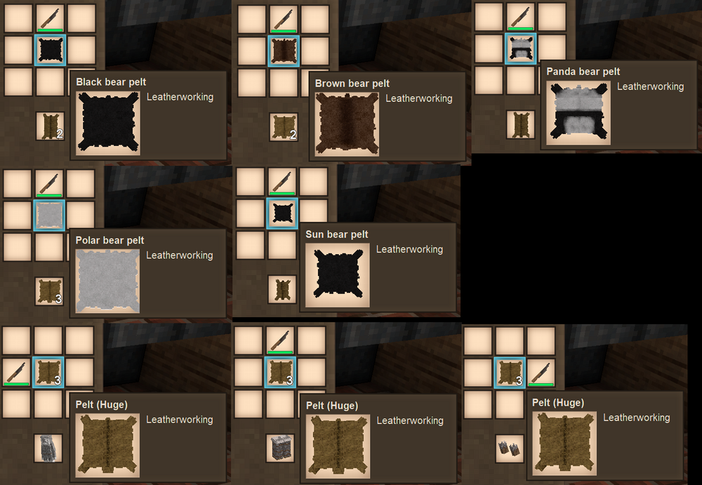 Wasn't quite what I was looking for, but close. At the time I did remove the head from the hide to get a bear pelt, but I wasn't allowed to in any way change it into a generic pelt or do anything else with the pelt besides make armor with it. However, since the game has received a patch (v1.21.1 stable), you can now take a knife to the headless bear pelt to get the following: Black Bear Pelt + knife = 2 large pelts Brown Bear Pelt + knife = 2 huge pelts Panda Bear Pelt + knife = 1 large pelt Polar Bear Pelt + knife = 3 huge pelts Sen Bear Pelt + knife = 1 large pelt 1 huge hide + knife to the left = one fur coat 1 huge hide + knife on top = one pair of fur boots 1 huge hide + knife to the right = one pair of fur gloves -