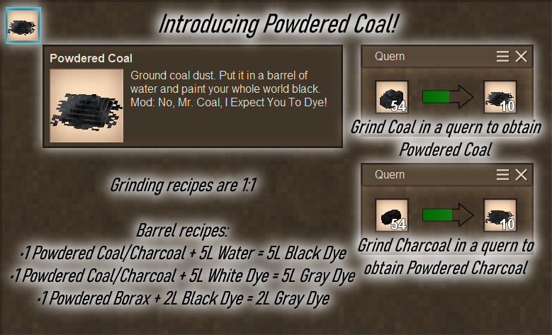 Coal and charcoal have been ground up and mixed with water to make dyes for ages. This mod adds said utilization to the game.