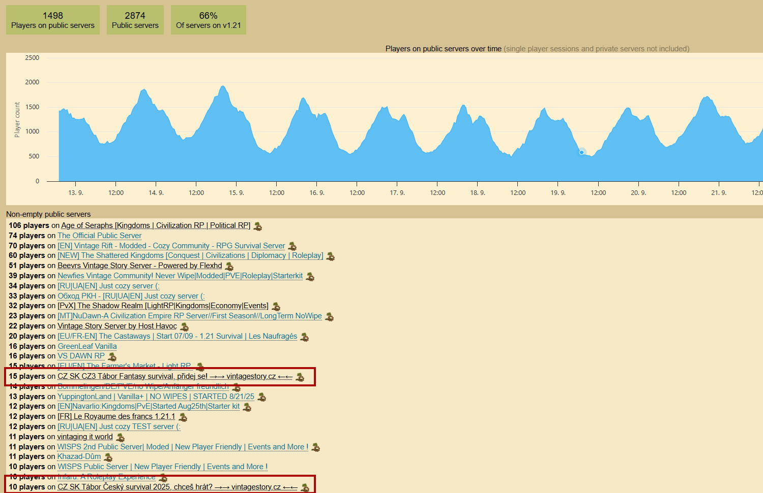 Vítejte na Česko - slovenském serveru Proč hrát s námi? Hráči: Survival je výhradně jen pro české a slovenské hráče. Zajímavé módy: Server nabízí spoustu úžasných módů, které zlepšují herní zážitek a posouvají hru na vyšší úroveň než běžná "vanilla" verze. Je tu i spoustu vlastních módů a úprav, které nenajdete nikde jinde! Lokalizace: Všechny módy jsou přeložené jak do češtiny tak do slovenštiny! Ideální pro všechny: Server je vhodný jak pro začátečníky, tak pro pokročilé a je family friendly. Přátelská komunita: Velká komunita hráčů je připravena poradit a případně potřeby pomoci. Bezpečný přístup: Server je "whitelisted" (aby se na server nemohl kdokoliv připojit a škodit) – pro přístup stačí vyplnit jednoduchý formulář. Zábava: Ta tady nikdy nekončí, pořád je na čem pracovat nebo co prozkoumávat. Praktické funkce Zavedený systém domovů ( lze se portovat /home ). Při smrti můžete v pozdější fázi hry využít i příkaz /back Webová mapa na stránkách. Propojení herního chatu s Discordem. Demokratické hlasování o důležitých změnách. Přidej se ještě dnes --> https://www.vintagestory.cz/ Nastavení serveru ------------------------- Server v češtině + mody přeložené do CZ + SK Backup & restart vždy ve 3:30-4:15 1 měsíc = 30 dní, IRL 48 minut = 1 den ve hře Jídlo se kazí pomaleji Příkazy /spawn /home /back Pravidelné updaty na novější verze Žádný wipe