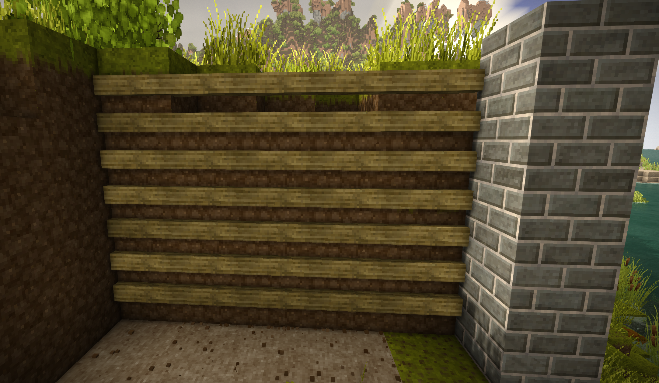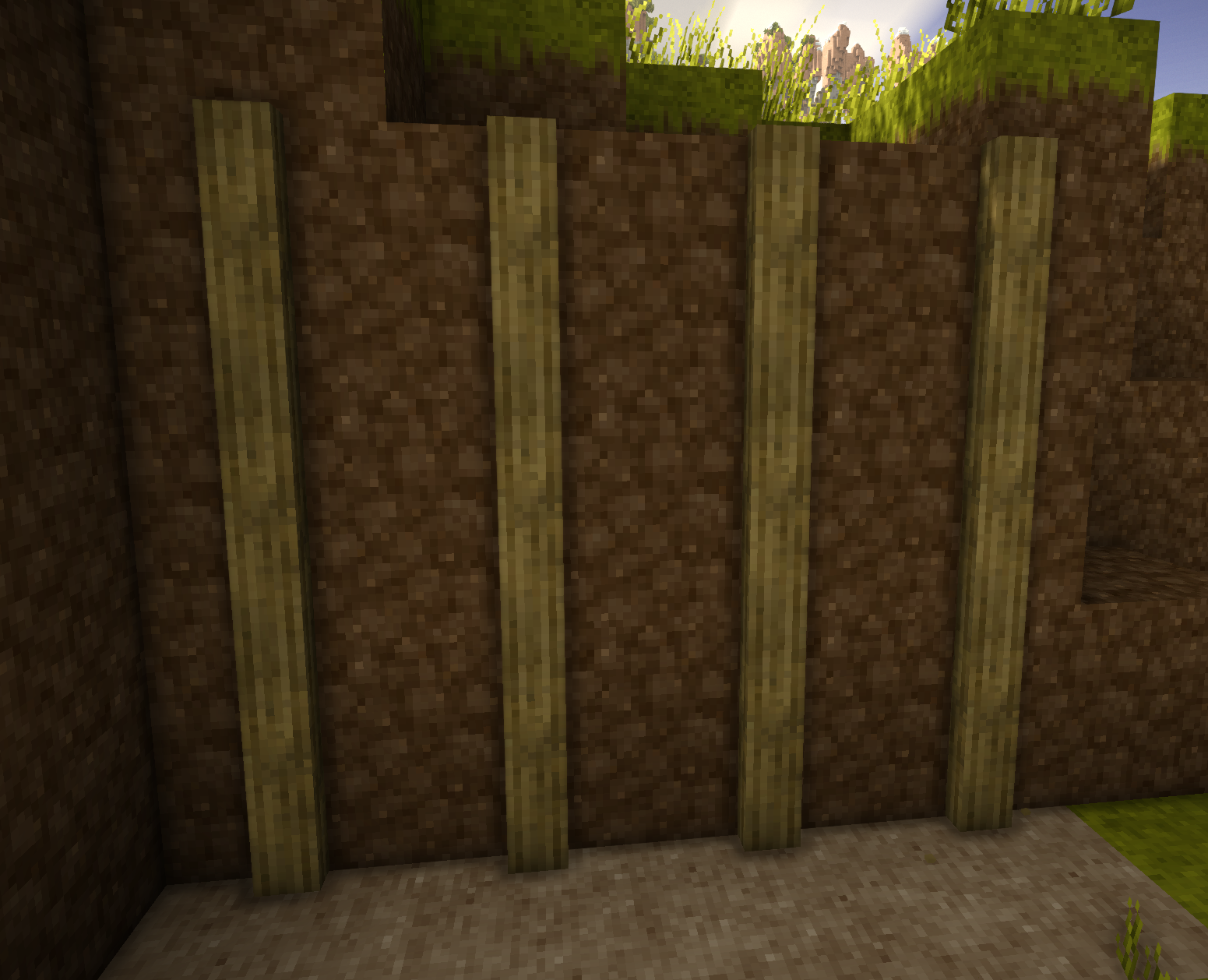 It would be nice if support beams could also provide vertical support for things like dirt when soil instability is turned on. Being that it is a form of instability after all. The video attached below shows a wall blocked in with support beams. These beams fail to hold even the blocks that are right up against the wood. Configurations/Builds wouldn't necessarily have to look like the one in the video. It could be one beam per wall column, multiple beams stacked horizontally, etc, etc. (example photos below.) Technically, this can be done by placing one beam per block space, one at a time. This is because their hit-boxes register as blocking the blocks' falling paths, but you only get one hit-box per beam placed. This is tedious and slow, and even limits making certain designs with the beams (example photo below.) So, it would be nice for the walls to recognize the full length of a singly placed long beam (like stone ceilings do). Then, we wouldn't need all those hit-boxes, loss of creative freedom, or the increased time consumption. Support Beams Issue.mp4 Other Designs Examples: Stacked Beams Ground "embedded" beams, centered per block column. Block-by-Block Curving Issues, 3x10 blocks example: The beam going from bottom-left to top-right was placed as a single beam. The beams running from bottom-right to top-left were placed block-by-block. This led to crooking and curving in a number of spaces due to the increased number of used anchor points.
