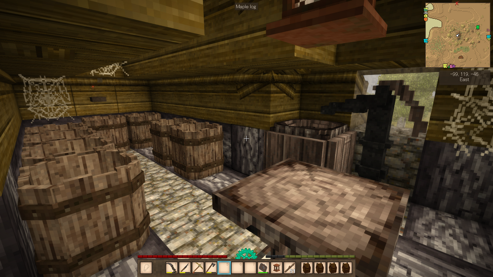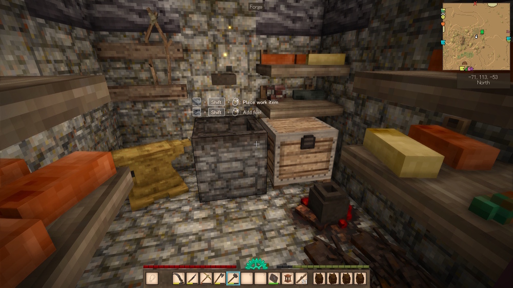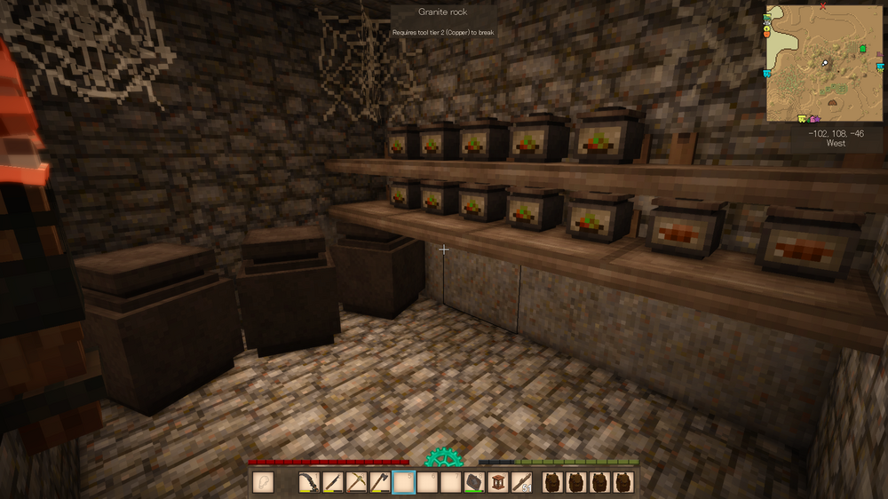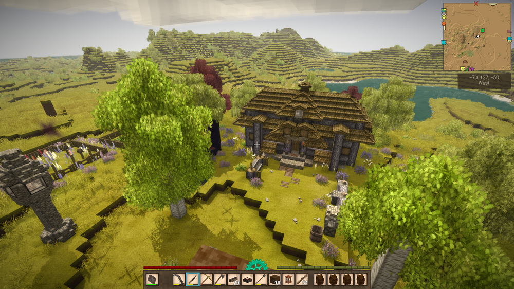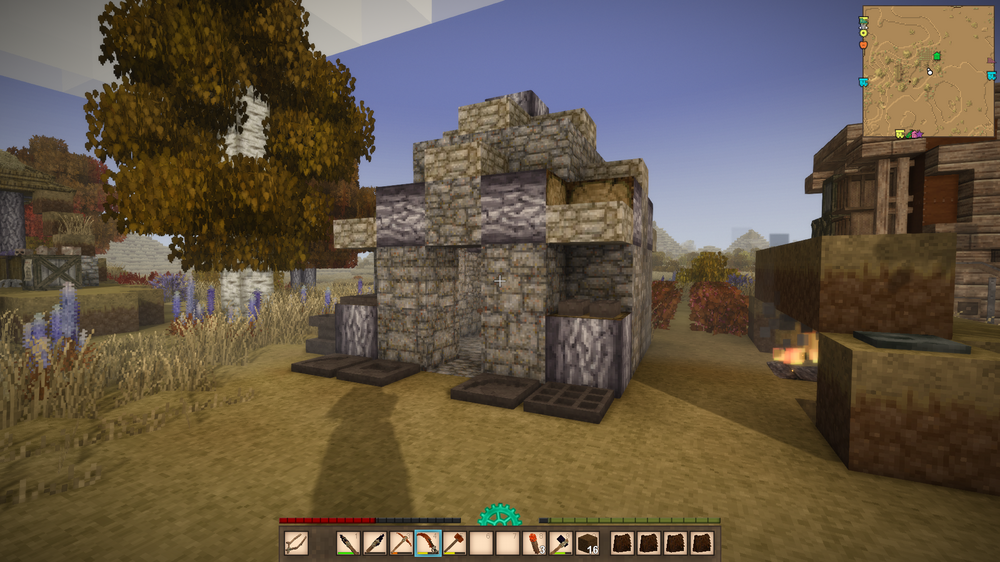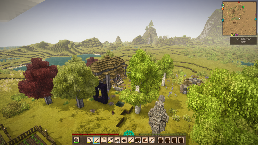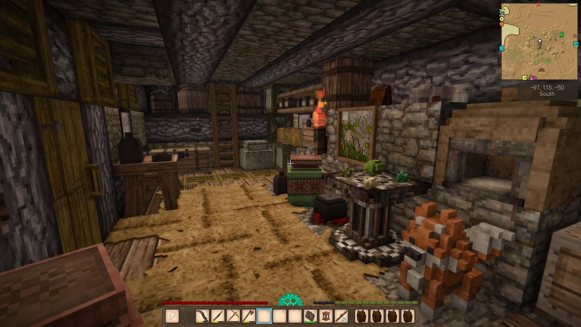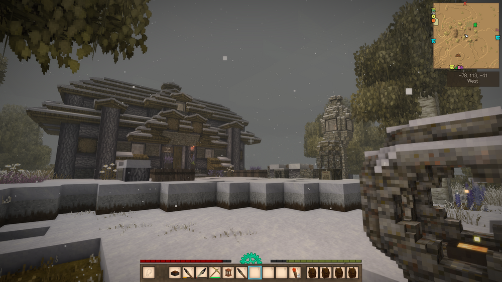 Hello to whom ever finds this. It has been a while since I came here. Not long for you perhaps but it as been a year for me in this world. And that is exactly why im writing to you today. Because today marks the day where I have survived and flourished in this world for a full year and I wanted to show you how far I have come in my adventure. This small hut is where it started. Built from the cobbled remains of my first ruins it was as much as a home as I could have managed at the time. It was just a 3x3x3 with an open side, not even a door, just enough space for a makeshift bed to keep me, my firepit and meager collection of personal items out of the rain. And it rained a lot. Aside from the rain on nights that were particularly bad with the creatures of the dark I had to board my entrance with dirt just to keep safe. Thankfully I have gotten past those days and have transformed the small hut into what is now my smithy where I forge my tools. I've been on copper for most of the year until finding tin during a random cave dive. Not much but enough to make something that lasts and even an extra pick to pursuade a local to tell me about a location of great significance. What that location holds however I have yet to discover. For most of my time I have lived off the land in my small and increasingly cramped box. Unbothered by the weather and unthinking of the food I would need. Meat cooked and eaten quickly with berries around every corner. It was already autumn and I have spent my time exploring rather than building for the future. But I realized I may have been reckless in this way of life. Winter was approaching fast and berries would not help me last through the winter, so not only would I have to put more meat on the table, I would also need a proper place to store it and for me to brave the cold if I wanted to make it through this. So mere days before the first snow fell I started the construcition on what should become my proper home in this place. At first just a ground floor.and a stairway into the ground to be my cellar. I had not begun working properly on a forge yet either so to keep the cold out for now I had to settle with a door I had bought from a Trader in the forest. Food was the greatest concern. All the meat I managed to hunt went into filling and sealing crocks now and at first the door was dedicated for the cellar to make sure it lasts while the front door was crudely put together from sticks. A measly bit of grain I found while exploring and a couple logs with sealed crocks on them where all had to show for when winter came. I feared for my survival and my stomach regularly growled at me. I thought I had made a mistake that would cost me dealy with my supplies seeming to get used up slightly faster than I could manage to restock them. And at the mere cost of being outside in the cold I thought I would not have enough to just stay indoors all winter. Something had to be done. It began with the quick remodelling of the freshly abandoned small home. I needed a forge to properly work on my home so it can keep me alive. Tools were made to facilitate just that. Shelves to better store food. And doors to properly keep out the cold. And the time that was not spent building was spent on gathering what little sustinance can be found in the cold. Proper hunting is tough when most of the large animals are nowhere to be seen and foraging for the last mushrooms in the snow was a race against the clock. But the future was looking brighter than I could have anticipated. Through good effort and a great helping of luck I got the survival aspect covered for now and food was at a stable supply. Stable enough that I found myself with time on my hands that I didn't think I could have in the winter. So I got to work doing more. It started with leather work. A few barrels outside for the start. Eventually with the proper completion of the house after completing the roof it moved inside into my new attic.Which like my forge has become my new workshop. The pelts I had until that point served well to keep me warm but something to guard myself against the hazards of the world would be made here along with more of the utensils a proper home would need like more pots, plates and anything you could imagine bulding with clay. And it was in this workshop that I made a new friend. You might call me a crazy person to consider the company of a carved rock to be comforting but it is a very good rock. Chiseld from a block of Bauxite Fauxite this friend was made. Though a faux fox it may be and even if its stoftness pales in comparison to the wild animals outside this one was special to me. And so this Rocky Fauxite Fox shall be my companion for the times to come. Home... This wasn't just a house anymore. Day by day it became not just just housing to shield me from the elements. It became something to call home. It was in the harshest of seasons but by the end of it I was not just surviving. I was beginning to thrive! On The winter was ending and my dedication was rewarded with another stroke of luck. In my exploration of a massive cave close to home and nearly getting lost and almost perishing in it twice I found an enormous and rich vein of magnetite iron. Going from struggling to make copper and having only the most valuable of tools made from the tinned bronze while most of my tools were still fashioned from stone and obsidian, I had immediately made the move to a full set of iron tools. And not only do I still have ore to spare after my long nights of forging, I still have yet to deplete the vein I have discovered. And there we are. The last month before the year has finished was my most productive so far. So lets take a look at what the place looks like now: . I have managed to gather a couple chickens. At first just one but by now they total three. They are still nervous around me but shall assist me in my endeavours of not starving so I will take care of them as best as I can. I have also begun fa