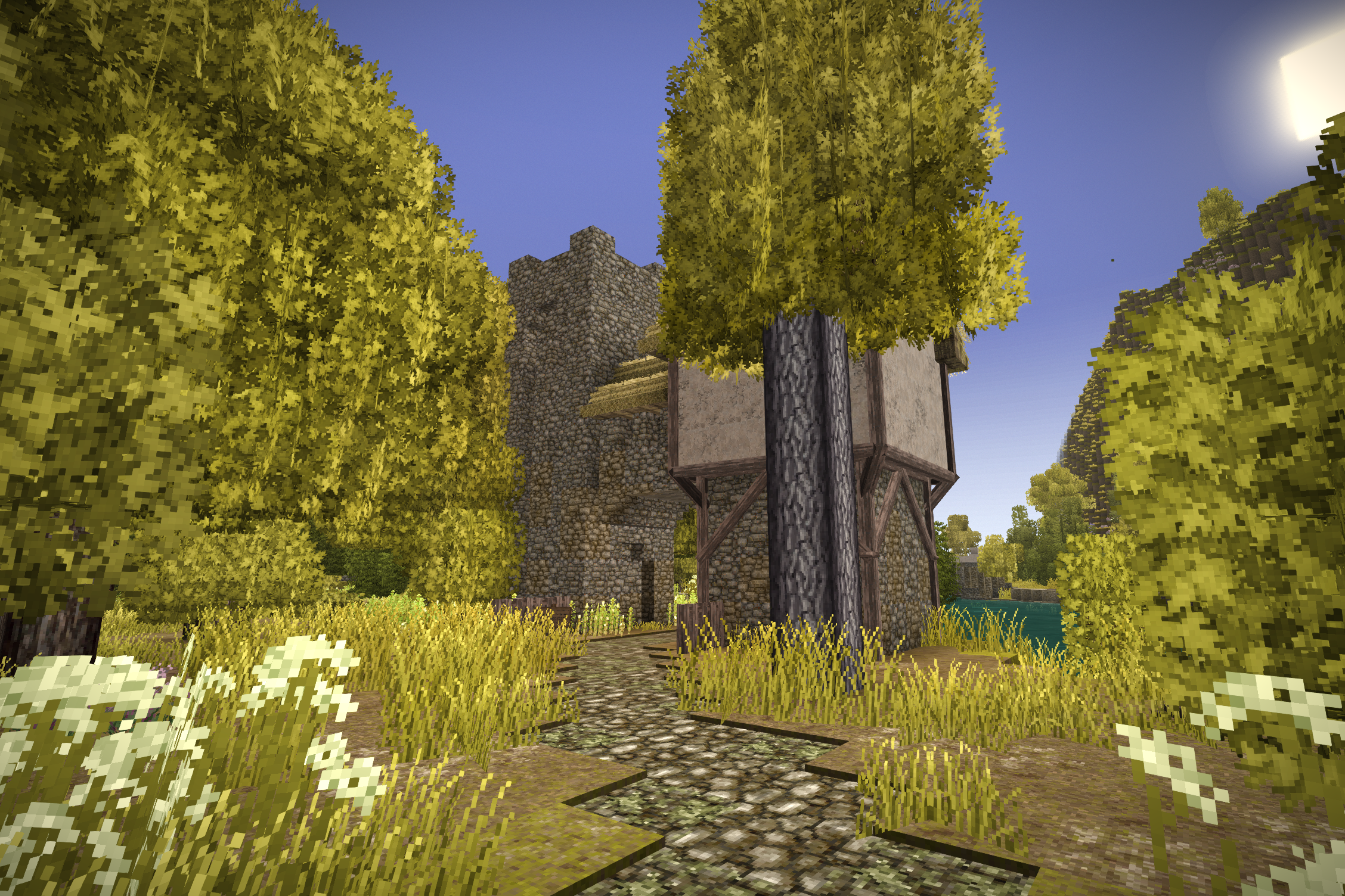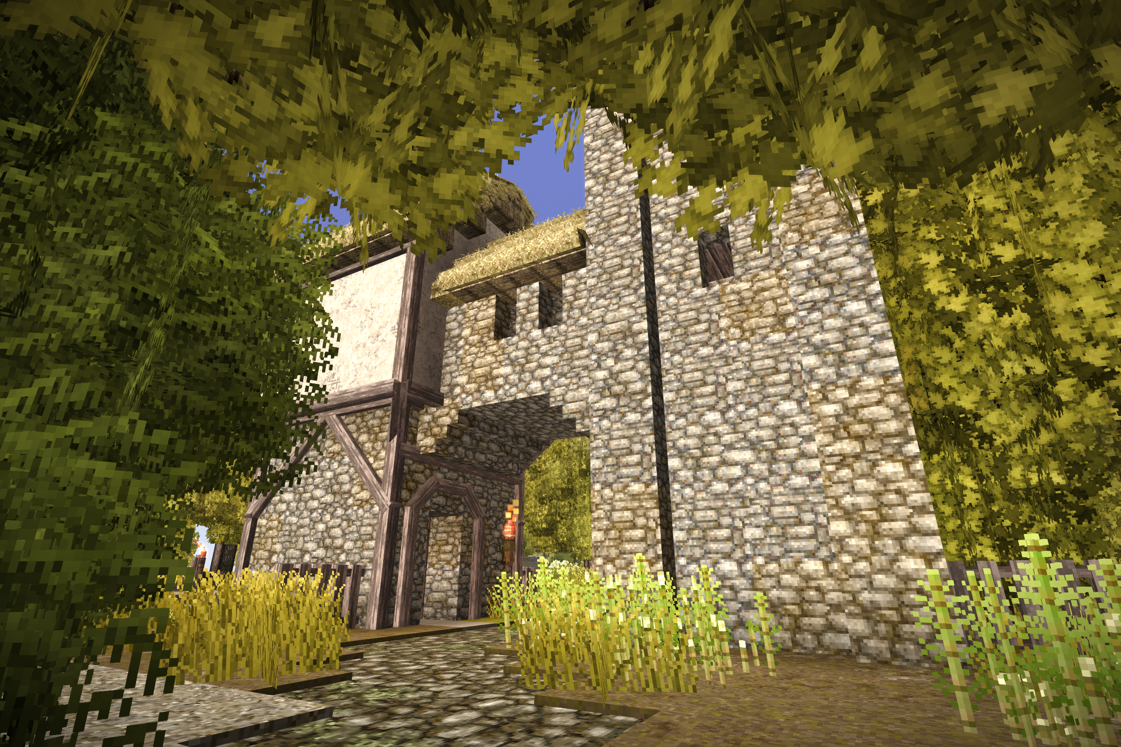 Following on from my last post I didn't want these first two buildings to end up being the center of my town. I wanted them to end up on the outskirts as I built larger buildings around a central hub. So I needed to decide where that hub would be. I picked out a location up river and decided to start planing out where the walls would go. I built this gate house half way between the future town square location and my starting house/hut. The interior is currently un-decorated, you can enter in the small alcove seen in the first photo. A ladder leads up into the wattle and daub living quarter. And the bridge takes you over to the tower which has a similar ladder up to the top. There isn't a great view as the area is so heavily wooded you can only see the tops of the trees. This building doesn't really server a purpose in my survival world but I think it looks great and I love traveling down the path through my woods and under the bridge.