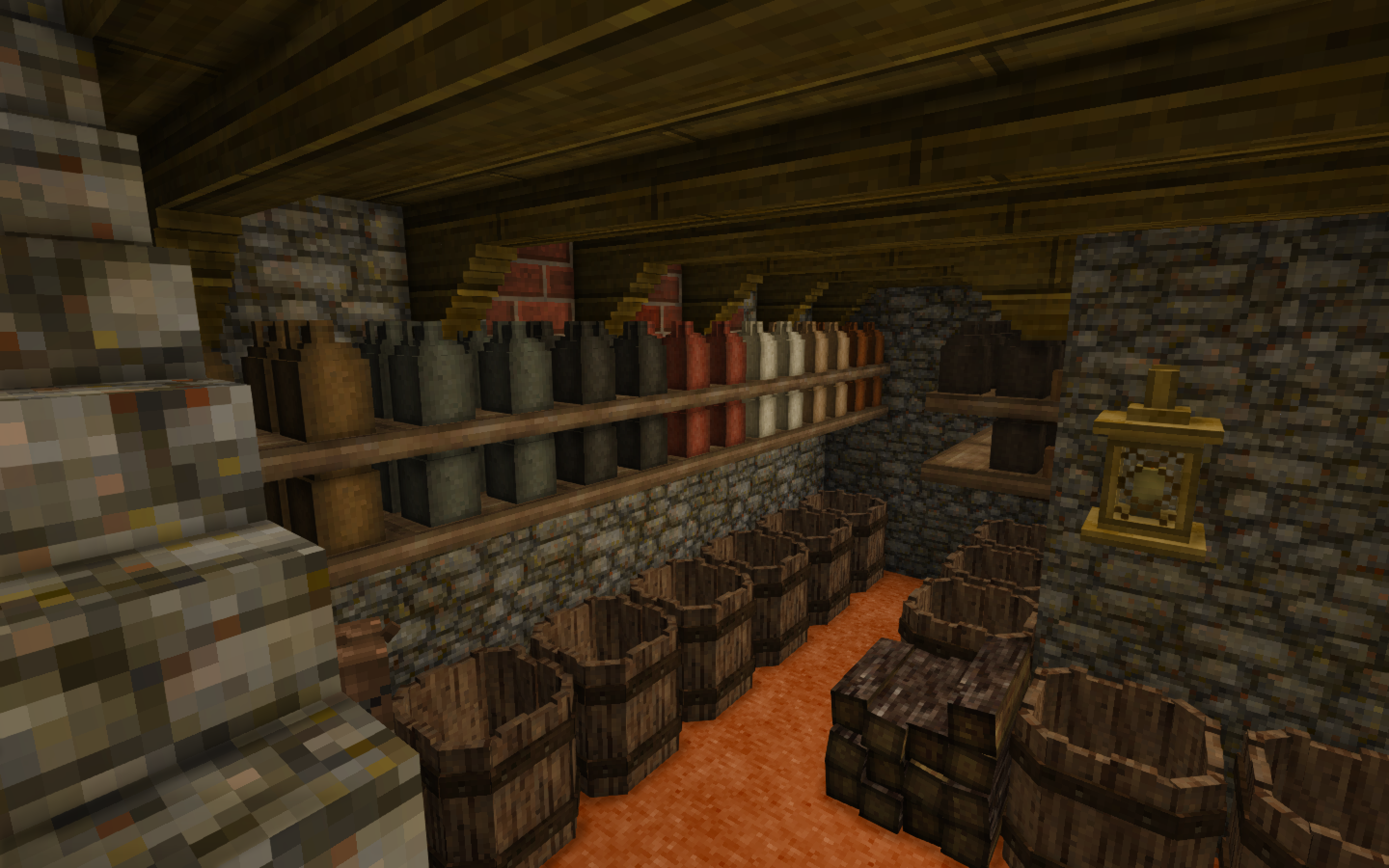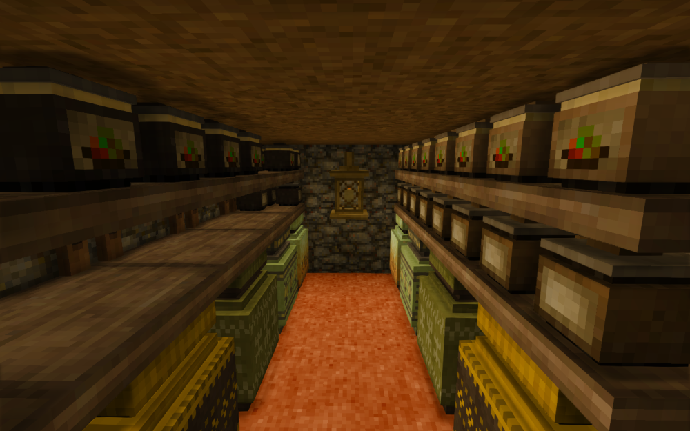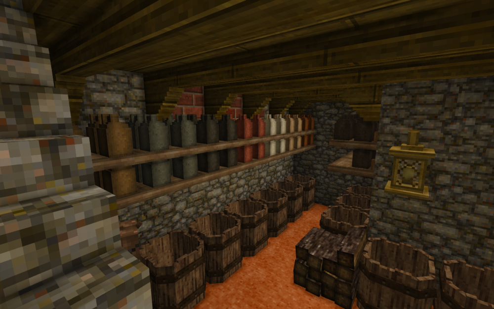 Well I decided to make a basement alcohol storage and color coat each type of alcohol by clay color, only to not find a Blue Clay deposit for the first 256 hours and 40 minutes. So I spent hours and hours panning gravel to get the blue clay to make all the pretty jugs I wanted. But hey, now I got a basement that looks like this: -