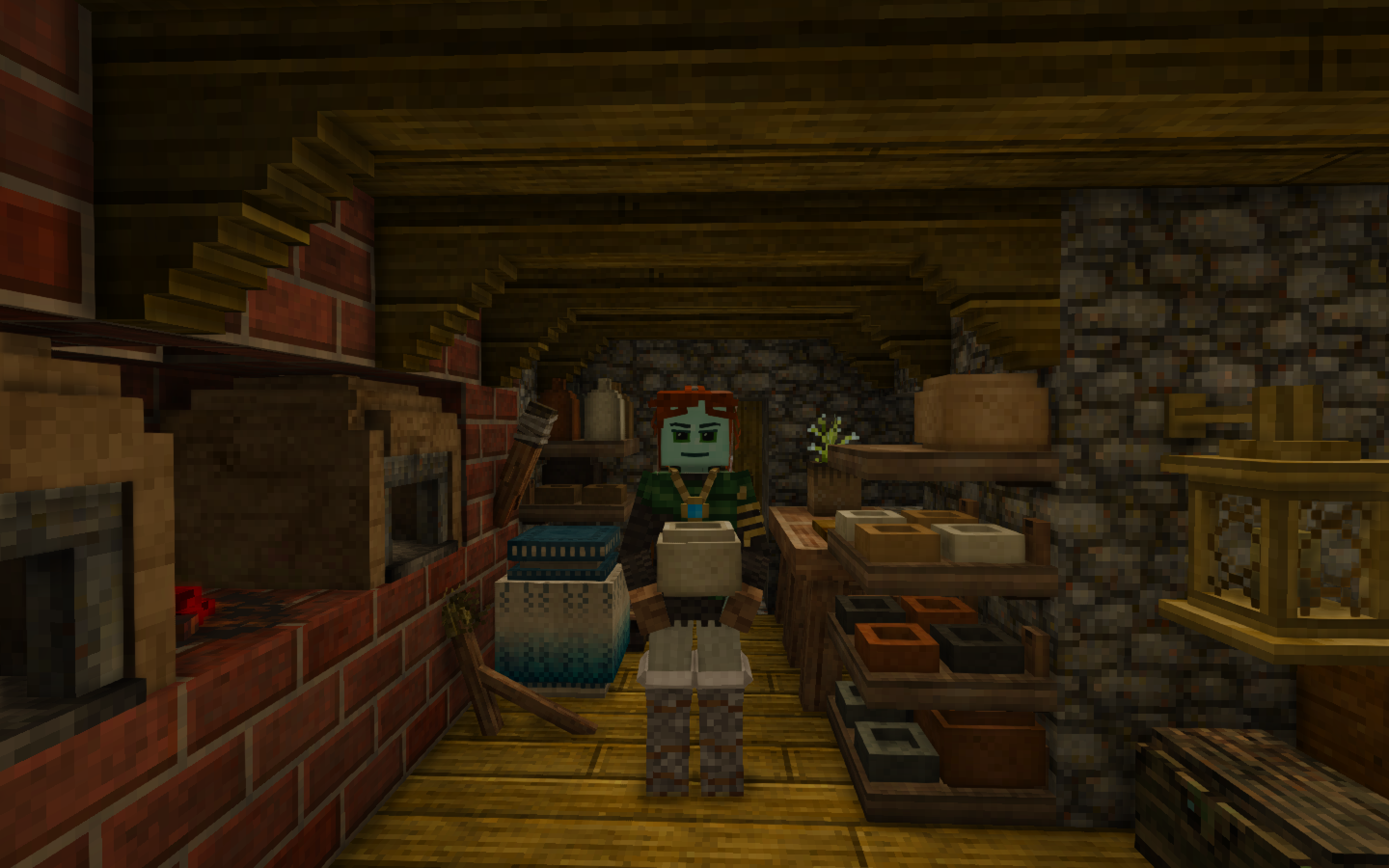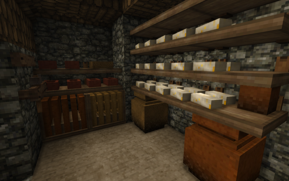 Having now put a few hundred hours into this game over the last few months, I can say that (for me) the most fun in late game Vintage Story is the colored ceramics and the chiseling. There's just something so rewarding about filling the shelves with pretty cooking pots, crocks, and bowls. Especially for my current build where I got really into alcohol brewing, and decided to make my two storerooms have color coded jugs for each type of alcohol present (something that took quite a while since I didn't find blue clay deposits until 265 hours into this world, so 2/3rds of the blue clay jugs were made from panned clay. No I do not regret the 15 or so hours of panning gravel to get it, it let me catch up on podcasts ). For those wondering the jug color/fruit pairings I use are: Tan: Apple Orange: Pear Red: Red Currant Brown: Cranberry Cream: White Currant Græy: Blueberry Black: Black Currant Fireclay: Cherry and Honey (when 1.22 comes out Cherry will go to the new Earthen Orange) Dark Brown: All types of grain alcohol (Rye and Spelt). I also deeply love the specialty ceramic jugs and flower pots you can buy from traders. And would love it if they also sold bowls and jugs in those patterns (since it would let me add more types of alcohol to my shelves, and also I think a beehive pattern bowl/jug would look really beautiful). Apart from just food, having smithing molds as an option, even if by the late game most of them aren't the most useful, is just wonderful to have. And the bricks and shingles options make for wonderful additions to any build. So this is my way of saying thank you to the developers of this game for making such wonderful things as the beehive kiln and so many types of ceramics. It really is the small things that makes this game so special. If anyone else has screenshots of their ceramic setups or beautiful things they have made in Vintage Story, please feel free to share them below. It's always so wonderful to see what people are getting up to. So I'll leave you with a picture of my dinning set up. And now I'm off to find more meteor impact craters, as I've decided I want to build a castle made of Suevite. For how many can boast to have a castle whose walls were shock metamorphosed by meteors?