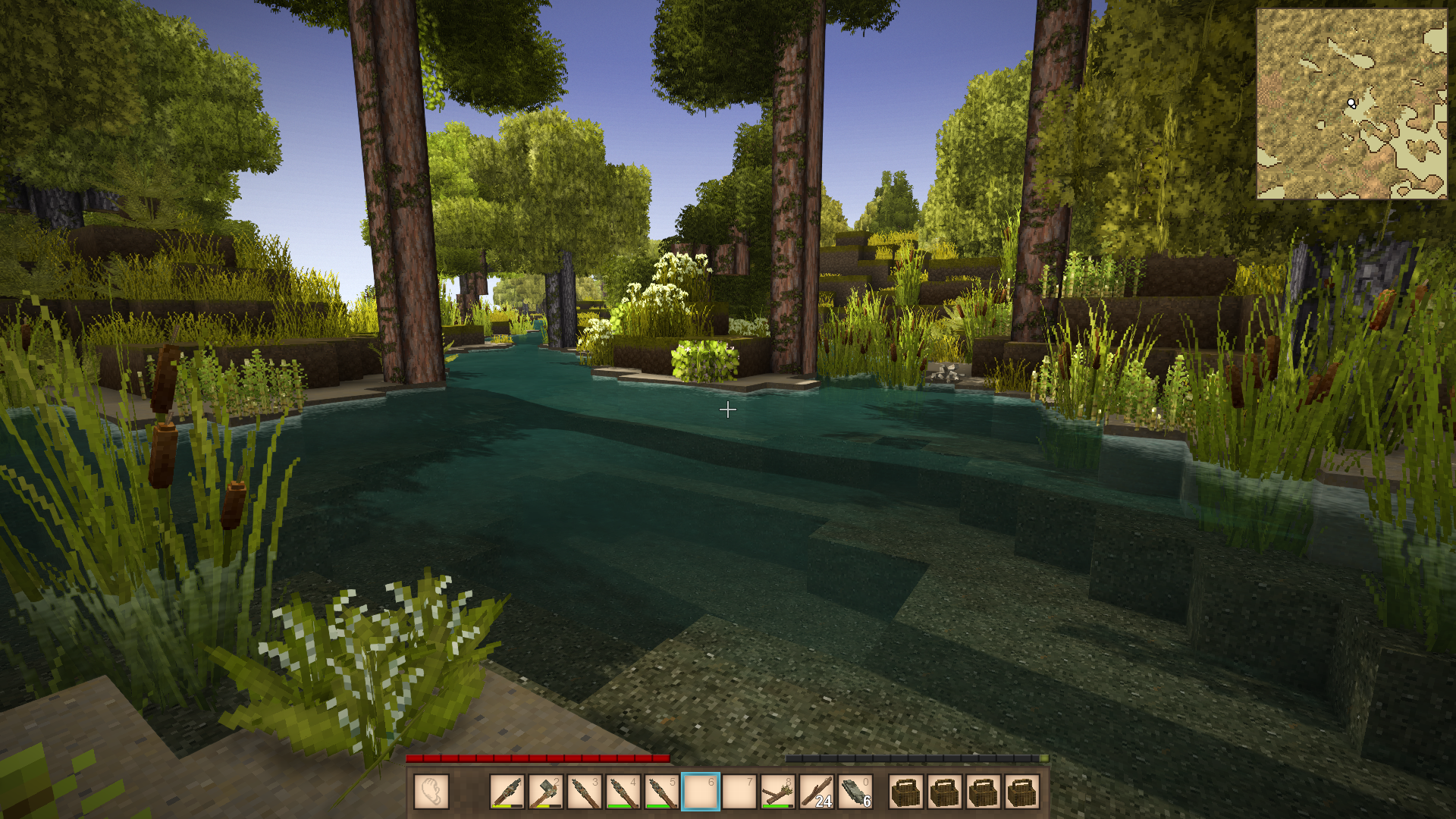 Yeah, I will start marking things when I once I have my basic needs somewhat under control and maybe a small shelter from which I can routinely explore. This time I can't find any reeds to make inventory to proceed... Admittedly, there are at least some berry bushes here. Finally! But also many wolves. I mean, I'm not deliberately acting stupid. I've just outplayed several wolves and am really trying to find my stuff. Can mushrooms be cooked over the fire pit? Can bags be made from something other than reed? If not, what do I do when night falls?