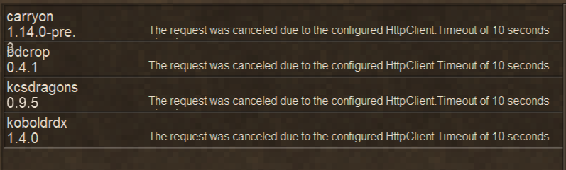 I recently discovered that I'm not able to download mods through the game itself. This first happened when I was trying to play multiplayer and said "yes, I'd like to download the mods used in that server", where I got messages saying "The request was canceled due to the configured HttpClient. Timeout of 10 seconds." I assumed it was just an issue with the multiplayer, but it's also happening when I try to use the 1-click download link on a mod's page. This also led me to notice that none of the mods I have in my mods folder are showing up in the in-game mods menu. Someone suggested this may have to do with folder/game permissions, but I'm not an expert on that sort of stuff (I'm on a Windows 11).
