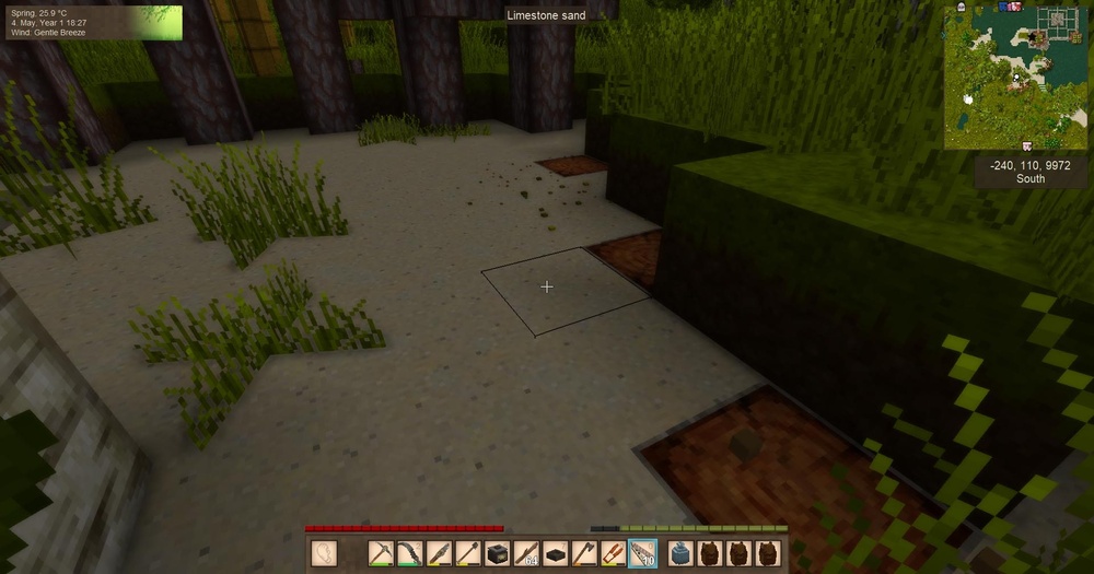 So I took this screenshot inside my 4 block underground cellar, at Y 109, with normal height generation. Loaded 1536 blocks to show the extent of the snow lol. On the top left edge of my loaded snow here you can see a patch of prospect points + a trader caravan, the area just south of that caravan is a yearlong snowy mountain, with larch nearby. I guess I just happened to get a colder spawn (my polar-tropic distance is 50k, not 100k). I'm technically already southwest of spawn (0,0 is red star on the top right just before sand area). Lovely area overall, though. The only thing I have to travel for, so far, is lime (3k west or 10k south). I also can't find chalk/marble, but whatever.