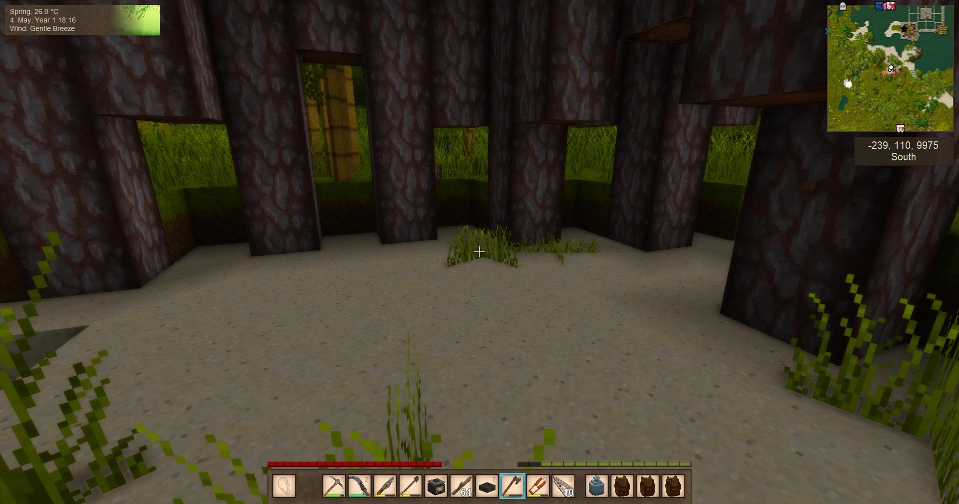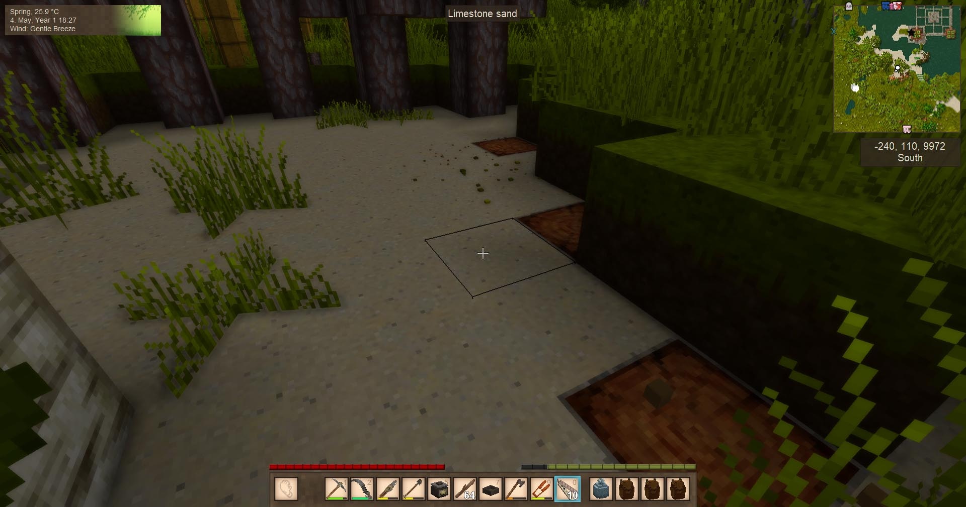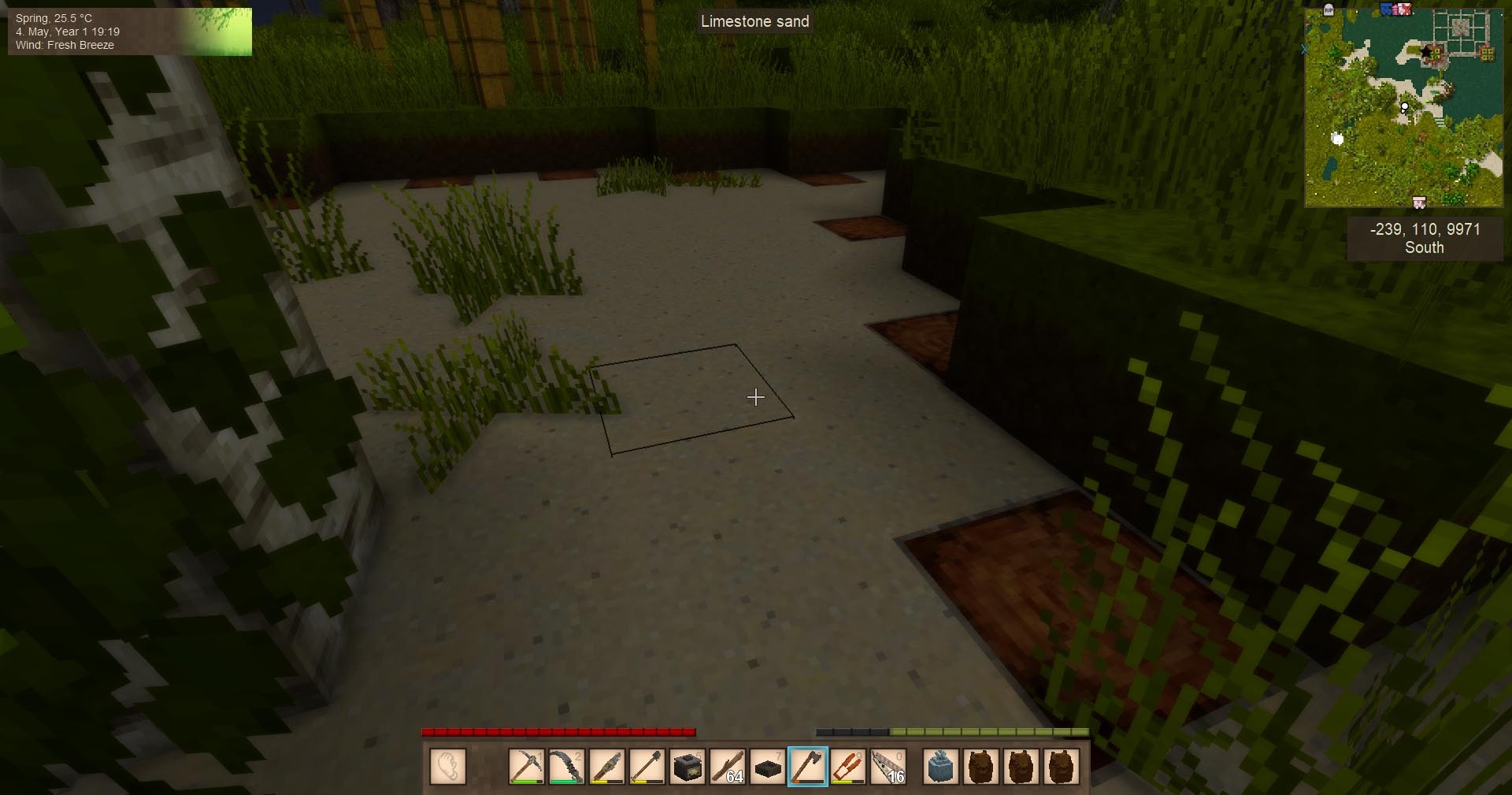 I guess I just happened to get a colder spawn (my polar-tropic distance is 50k, not 100k). I'm technically already southwest of spawn (0,0 is red star on the top right just before sand area). Lovely area overall, though. The only thing I have to travel for, so far, is lime (3k west or 10k south). I also can't find chalk/marble, but whatever.