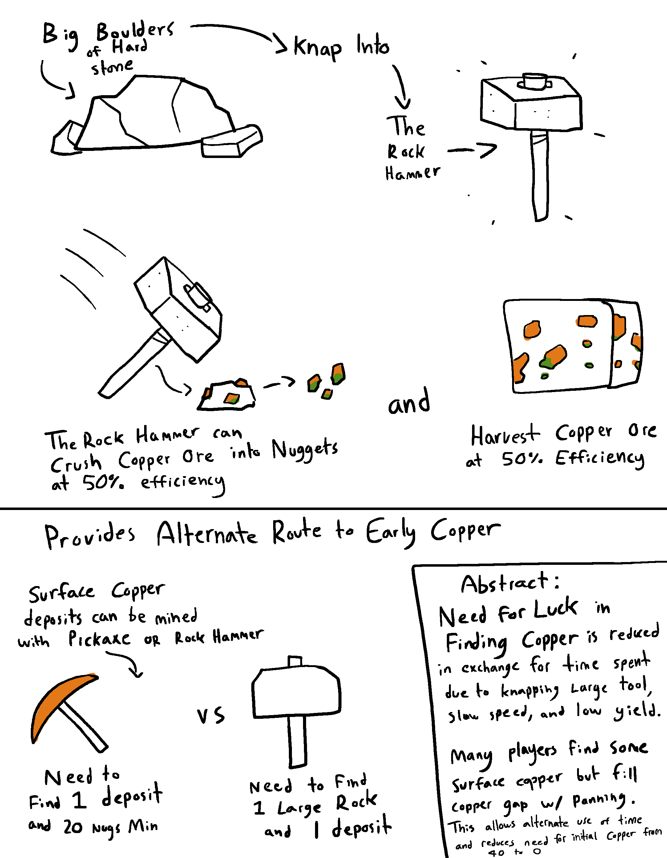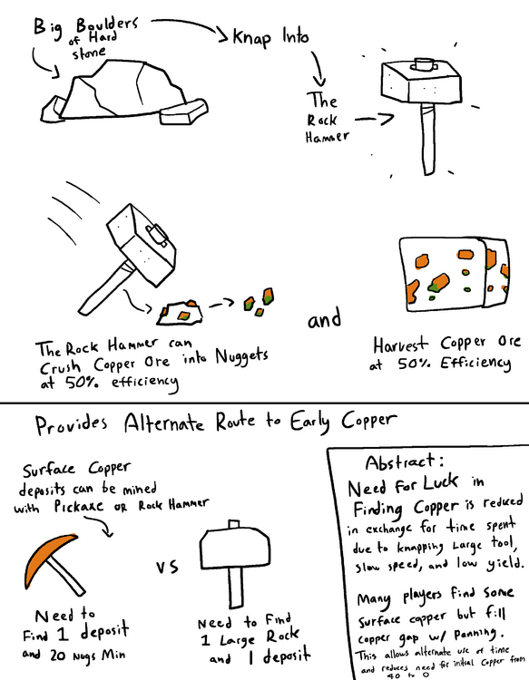 When new players seek out copper, the two options they have are to either: Locate 40 Copper Nuggets via Panning and at least one surface deposit to come back to (20 for the Pick, 20 for the Hammer to process the ore) or Pan 60 Nuggets (20 for Pick, 20 for Hammer, and 20 For a Prospecting Pick as you do not know where any copper ore is) My idea is to allow the player to use the large clusters of rocks that sometimes spawn to produce a very crude hammer which is capable of crushing ore into nuggets or harvesting stone and ore at greatly reduced efficiency and at a higher time cost in making multiples of the tool due to low durability and its slow mining speed. The reason I believe this could be a good addition is that it provides a player who might be having trouble finding large amounts of surface deposits to reach the required 40 nuggets the option to be more proactive and source a tool that will allow them to take advantage of the minimal copper they have discovered. I do not feel this is imbalanced or unfair as in exchange for insulating the player from bad luck it demands more thought, time, and action to get to the end goal (The Ability to prospect and mine ores) Please feel free to comment on whether you think this is a good or bad idea or what could be changed.