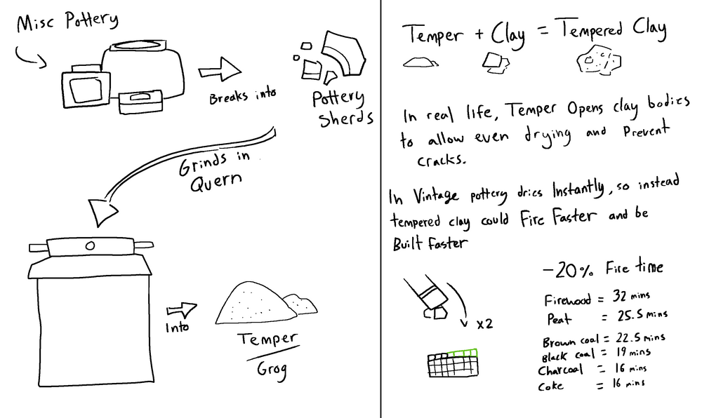 In real life primitive pottery, you quickly learn about something called Temper. Temper is any non-plastic non water absorbing material. Usually it's ground up old pottery. Because unlike clay it does not expand, it cannot crack or distort as it dries, which means the pottery will dry more evenly, expand and shrink less, and won't crack. Of course, in Vintage clay dries instantly so I propose for the sake of having some fun stuff that makes a nod to real life that temper can be produced and added to clay to make a faster building, and faster firing clay body. This is still realistic as greater strength and resistant to thermal shock are both positives of Temper