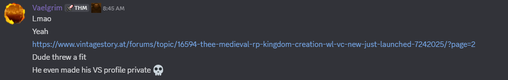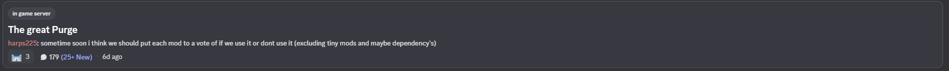5. I Didn't demand anything personally, or attack you or your person in anyway. Everything I said is true, and your reply mostly agrees with what I said. I just feel it should be made more abundantly clear so as people know exactly what they are getting into. Evidently, from the current state of the server, most of the player base did not understand this and hence why they have left. The performance metric there is just a straight lie. I have played on the server a fair amount, and have interacted with the entire community. Three of my friends that all have 32+ gigs of ram all have the same freezing issue, at the same time. Blaming a servers performance on a clients ram is technical illiteracy. I'm not going to argue on a public forum when your response is to whinge about it in discord looking for validation, and attempt to gleam any information you possibly can about who I am from my profile. I know the kind of person you are and that is why I set it to private, and you proved me correct. I don't think anything I've said here is said with malice, its just information for potential players so they can truly understand what kind of server they are joining. From the reactions of the players, this was not made clear enough in the post. Edit:) You also make the entire community look bad when you interact poorly in other communities, and barre the entire server from being able to be advertised in the main vintage discord. You do not only act this way in your own community, but everywhere.