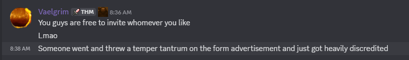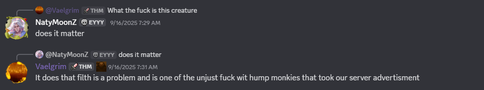 3. If there is a mass exodus from the server, with it currently averaging sub 5 people per day from ~15-20 when I joined they did not understand. What false information have I posted? I hid my profile for my own safety. (In response to you yourself posting the twitter profile of the mod that dealt with the advertisement thread) 247 specific instances of the word lag, not accounting for the word freeze, frozen, froze, etc since its hard to differentiate between people talking about the server freezing, and them freezing to death. I'm not trying to be disingenuous unlike you. The server has not been up for three months, it was started 7/23, two days over two months from today. that would equate to at least 4 instances of lag per day bad enough to be talked about. You seem very confused as to why this post was originally made. You pay for your server, you run it however you personally see fit, I have no issue with that. I just think you need to articulate it a bit better, hence why I tried to do that. On a completely separate note, you don't seem to believe in your own philosophy. "But let’s be clear our words have never come with the intent to harm. We don’t target, we don’t bully, and we don’t tear others down for sport." You called a person filth, and a unjust fuck wit hump monkey. Keep comparing someone you don't agree with to a child throwing a temper tantrum. Openly post peoples information in general chat to ridicule them.