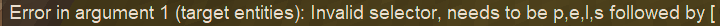 Pasting either of these into the text box, after spawning in a few entities, results in an invalid selector error. As do any permutations of /entity cmd stoptask ending with e[*], e [*], e[, e [ . I've tried the asterisk, the exclamation point, a blank space, alive=true. Inputting /entity cmd e[*] stoptask as suggested on reddit gives a different error, saying there's invalid syntax.