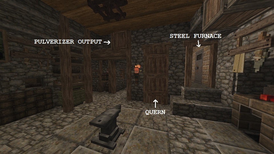 Here's my solution for an airtight, automated pulverizer/quern accessible from kitchen/smithy. The quern is powered from above, with a input vessel, 3 hoppers chuting into a vessel at the bottom (not the ideal 4 hopper setup but I couldn't fit it, this works adequately enough) The pulverizer has the input chest on the above floor, accessible through a door. Getting this all to work was a tedious endeavor (an eldritch abomination of axles and gears live inside my walls) but being able to do everything from one (warm) room is quite nice. -