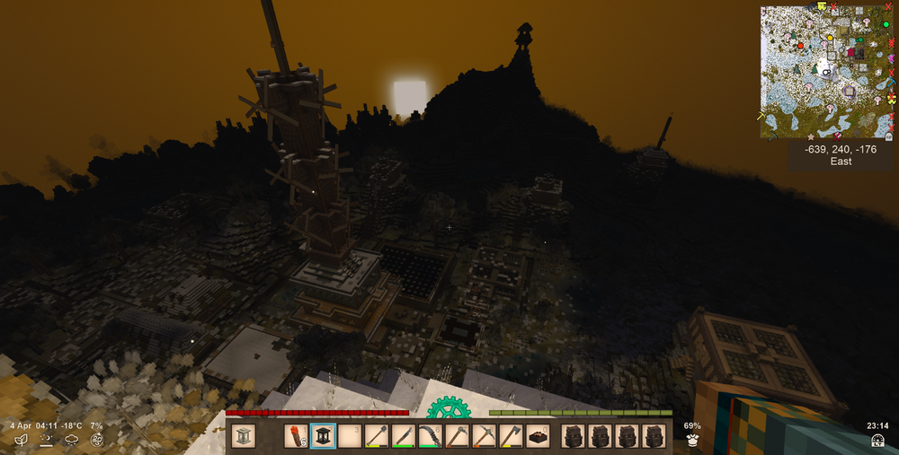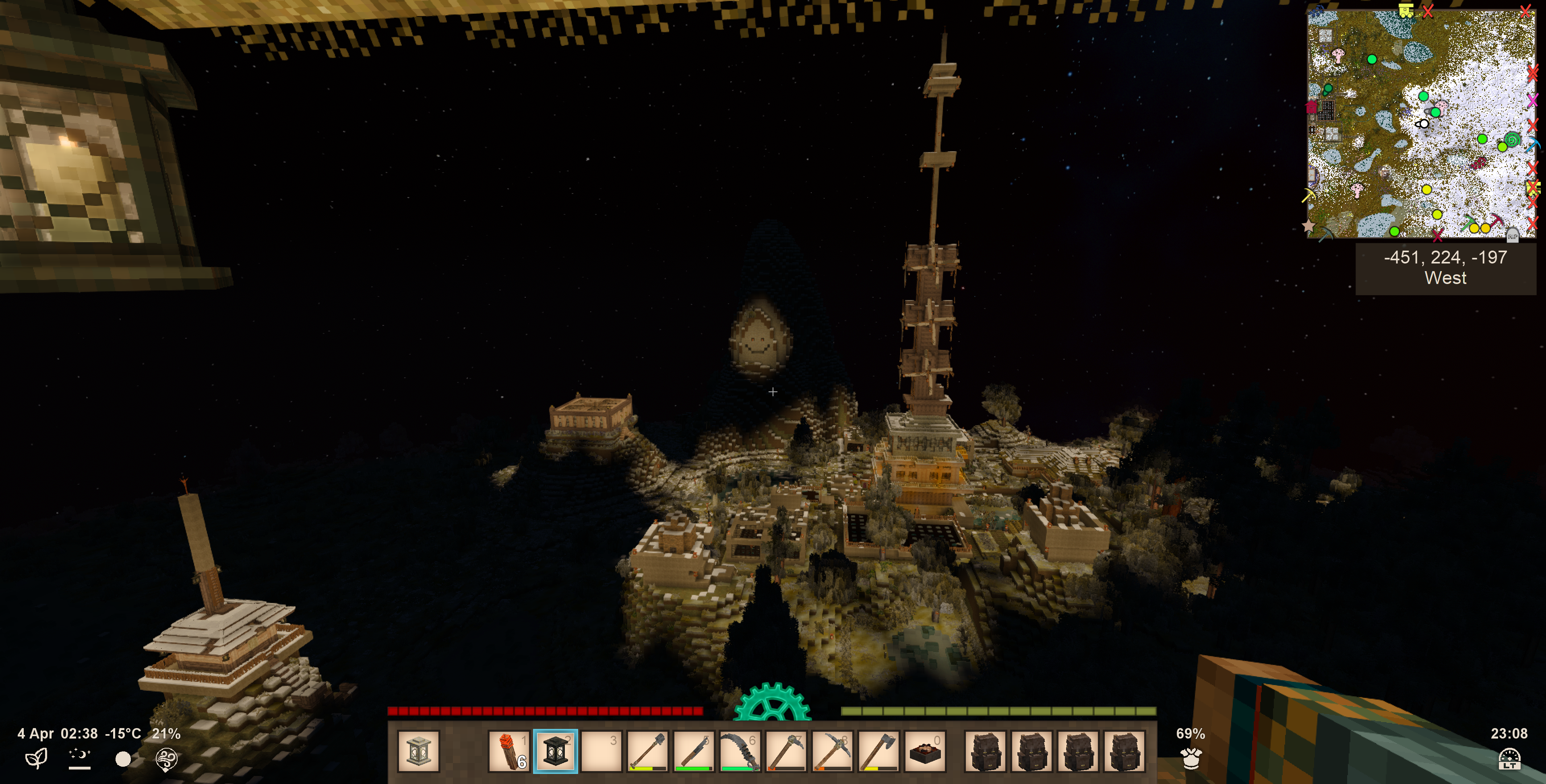 Just a few aerial night shots of our compound. Two of us playing, 30 day months, time set to double standard. Winter was very long, but we made it through. Managed to build just about everything that can be built (we've been holding off on the Lazaret, so no tech further than the Glider yet). We have Chickens (gen 5), Rabbits (gen 10), Pigs (gen 4), Goats (gen 2), and Sheep (gen 3). Pulled every berry bush and fruit tree that was outside of the radius of our base, and brought those back, surrounding each pond with a different type of berry. Our original farmland (and the reason I settled in this area to begin with) was loaded with High Fertility Soil, and that was surrounded by Medium. We now have four Greenhouses, as well. Two Apiaries, the first not built ideally, but the second is perfect. It took a lot of work, but we now have 50 skeps going. Beehive Kiln, Cementation Furnace, Coke Ovens, an enclosure for our Elks, built the Sailboat out of Redwood (not pictured) thanks to an Agricultural Trader that sold seeds. Made a barrel of each type of berry wine, and looking forward to adding the various cold weather fruit tree wines this year. We spent a lot of the winter hunting down the various ores to stock up, and now have trunks loaded with everything we might need. Managed to find almost every type of rare ore too, save for Uranium, which I have not gotten any readings for anywhere yet. I was worried we wouldn't have enough food to make it through winter, but we had one final harvest in October that really helped. Now we have enough food for 8 people, lol. We've done a massive amount of exploration, found teleporters all over the place, and are starting to plan a build for a second base in the South. (I really want to grow all of those crops and fruit trees in addition to what we already have, even though we don't need them). I have a series of teleporters marked that take us far enough south to a great location beside the ocean (not sure if those are from Vanilla or Better Ruins, or a combination, but it's great!) Also, my monstrosity of a windmill will get one more level yet, once the first Flax harvest of the year comes in. Don't need it, but going to do it anyway, lol. We're both loving the game, and can't wait to see what else gets added in the future! (And yes, I did put a smiley face on the side of a mountain. There's a door under there with a room loaded with barrels that will soon be filled with many types of Brandy, lol)