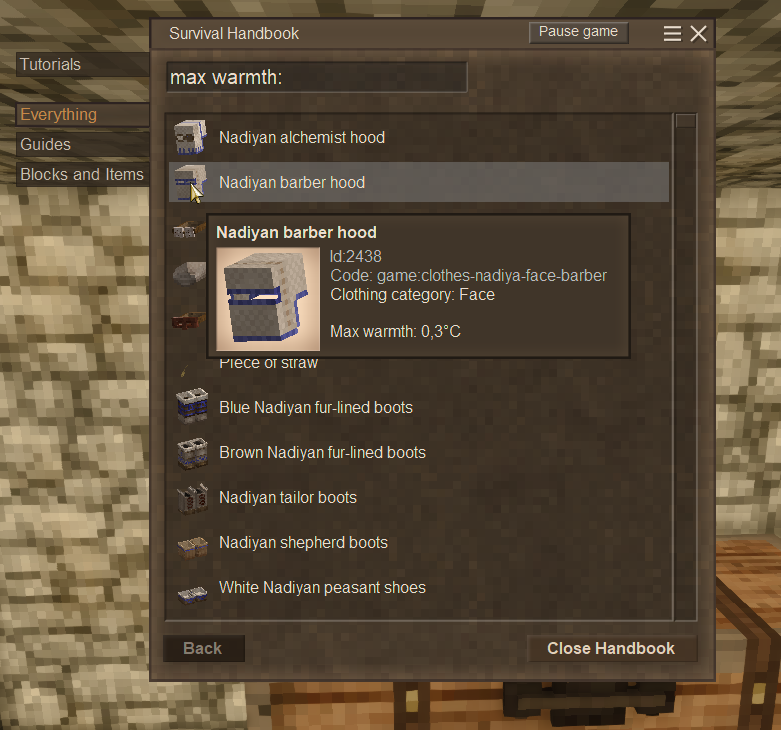 The handbook is already one of the best in game guides I have seen. And it has already seen some improvements, since I started playing. Still, there are many ways to improve it further. I am making this post as a collective overview of improvements I have seen suggested by others, and improvement ideas I have had myself. I will link to other forum posts, when I have found other posts also suggesting these things. 1. Problem: You frequently have to search the same entries again and again. Solution 1: A way to bookmark pages so, that they can be easily opened again, without having to search. Solution 2: When closing the handbook it could remember the previous page it was on and reopen that. These two solutions have slightly different use cases. I believe both would be worthwhile additions. Similar things have been suggested here and here. 2. Problem: It can be difficult to find out what variants are allowed for a crafting recipe. For example, I remember looking at the Mining Bag recipe and wondering what plates I can use for it. The only way to find this out, is by checking what plates are shown. Moving my mouse away from the recipe. Wait until plates change. Check what plates there are now. Repeat, until you are confident that only bronze plates and better are usable. This is annoying. Solution: When right-clicking a variable item slot, it should show a small popup with all possible items. Hovering over the items in the popup would then give you the item name, etc. Left-clicking them would take you to their respective handbook page, as usual. Left-clicking outside the popup would close it. Here is a mockup done by @Descruff on their forum post about this issue here. Their solution was slightly different from what I suggest. See their post here 3. Problem: Sometimes there are so many uncraftable items of a type, that it can be difficult to find what you need. For example, before my first winter, I wanted to use the handbook to find some clothes I could make. So I tried to search for “Max Warmth” to find all clothing items that give warmth. This gives you a list of many clothing items, where 99% are uncraftable. This is not helpful. I quickly gave up and used the wikis Prepare for Winter Guide to find the fur clothes. Even now that I have played the game for over 200 hours, I still don't have a good idea of what craftable clothing items exist. Solution: Filters A way to filter the search to only show items with certain properties would be useful. I would suggest one filter for craftable items, one filter for tradable items and one filter for unobtainable items (i.e.: decorative items from story locations, that otherwise clutter search results). There may be other filter categories that could be beneficial, but I would suggest these three at minimum. (Some other filters could be “Edible”, “Creature”, etc.) I would suggest these filters to be toggleable independently and have three states: On, Ban, Ignored. (Ignored would be the default value) If “Craftable” and “Tradable” are both on, it would show items that are obtainable through crafting AND trading. If “Craftable” is set to on and “Tradable” is set to ignored, it would show all items with a crafting recipe, ignoring if the item can be traded. But if “Craftable” is on and “Tradable” is set to Ban, then it would hide all items that can be traded, even if that item has a crafting recipe. I believe this system sounds more complicated than it is. It should be relatively intuitive to use. (Sidenote: I would also suggest the current “Guides” and “Blocks and Items” Tabs to use the same "On, Ban, Ignored" system, for consistency. The “Everything” Button would just reset all filter to Ignored. 4. Problem: Comparing multiple items with each other can be very tedious. For example comparing pickaxe mining speeds currently requires searching for “pickaxe”, opening one items page, remembering the value you want to compare, then going back and opening the page for a different item, repeat until you have compared all relevant items. This doesn’t have to require this much clicking. Solution: When hovering over an entry in the search list, it should show a brief item description, similar to when you are hovering over it in your inventory. Here is a quick mockup to show what I mean: This would allow players to quickly get the basic stats of an item and allow for easier comparison of different items stats. For example, comparing how good various clothes are, or comparing different tool stats, or comparing how much different poultices heal, etc. 5. Problem: Finding what stone types certain ore can spawn in is very hard to do in the handbook. There is a way to see something similar on the handbook page for the stone types: But usually the player wants to know the inverse of this: In what stone types does a certain ore spawn? Not what ores can spawn in this stone. Solution: On the page for the nuggets, show which stone types the corresponding ore can generate in. Additionally, it would be useful to also show the highest ore grade (Poor, Medium, Rich, Bountiful) that can occur per rock type. This information is already technically accessible via the handbook, it is just very tedious to gather it. 6. Problem: Many features of the handbook are never explained. Solution: Add a guide that gives tips on how to use the handbook. This should include quick descriptions for the bookmarks, filters and right-clicking to see all variants in recipes (should these be added), but even some features already in vanilla could be better explained, such as: Pressing “H”, while hovering over an item, opens the corresponding entry. Pressing “Shift+H” opens the entry for the block you are looking at. You can search for the descriptions and stats of items too (For example, searching “storage slots” gives all basket/backpack variants and all storage containers (chests, storage vessels, etc.)). These features are very usef
