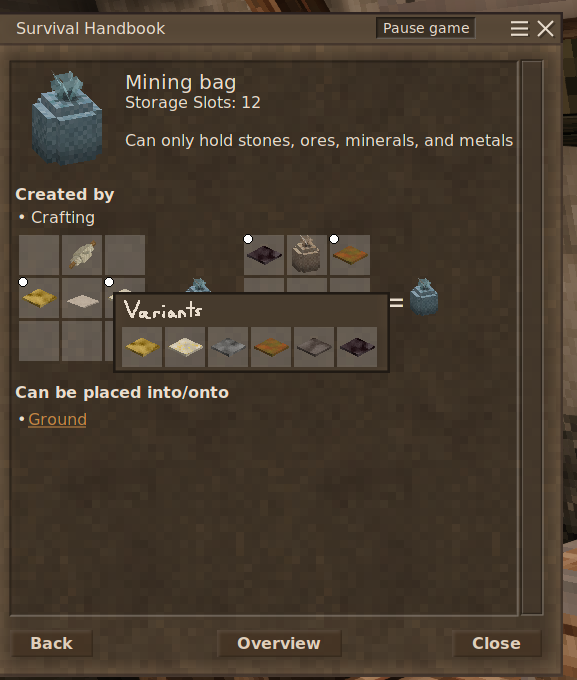 The handbook is already one of the best in game guides I have seen. And it has already seen some improvements, since I started playing. Still, there are many ways to improve it further. I am making this post as a collective overview of improvements I have seen suggested by others, and improvement ideas I have had myself. I will link to other forum posts, when I have found other posts also suggesting these things. 1. Problem: You frequently have to search the same entries again and again. Solution 1: A way to bookmark pages so, that they can be easily opened again, without having to search. Solution 2: When closing the handbook it could remember the previous page it was on and reopen that. These two solutions have slightly different use cases. I believe both would be worthwhile additions. Similar things have been suggested here and here. 2. Problem: It can be difficult to find out what variants are allowed for a crafting recipe. For example, I remember looking at the Mining Bag recipe and wondering what plates I can use for it. The only way to find this out, is by checking what plates are shown. Moving my mouse away from the recipe. Wait until plates change. Check what plates there are now. Repeat, until you are confident that only bronze plates and better are usable. This is annoying. Solution: When right-clicking a variable item slot, it should show a small popup with all possible items. Hovering over the items in the popup would then give you the item name, etc. Left-clicking them would take you to their respective handbook page, as usual. Left-clicking outside the popup would close it. Here is a mockup done by @Descruff on their forum post about this issue here. Their solution was slightly different from what I suggest. See their post here 3. Problem: Sometimes there are so many uncraftable items of a type, that it can be difficult to find what you need. For example, before my first winter, I wanted to use the handbook to find some clothes I could make. So I tried to search for “Max Warmth” to find all clothing items that give warmth. This gives you a list of many clothing items, where 99% are uncraftable. This is not helpful. I quickly gave up and used the wikis Prepare for Winter Guide to find the fur clothes. Even now that I have played the game for over 200 hours, I still don't have a good idea of what craftable clothing items exist. Solution: Filters A way to filter the search to only show items with certain properties would be useful. I would suggest one filter for craftable items, one filter for tradable items and one filter for unobtainable items (i.e.: decorative items from story locations, that otherwise clutter search results). There may be other filter categories that could be beneficial, but I would suggest these three at minimum. (Some other filters could be “Edible”, “Creature”, etc.) I would suggest these filters to be toggleable independently and have three states: On, Ban, Ignored. (Ignored would be the default value) If “Craftable” and “Tradable” are both on, it would show items that are obtainable through crafting AND trading. If “Craftable” is set to on and “Tradable” is set to ignored, it would show all items with a crafting recipe, ignoring if the item can be traded. But if “Craftable” is on and “Tradable” is set to Ban, then it would hide all items that can be traded, even if that item has a crafting recipe. I believe this system sounds more complicated than it is. It should be relatively intuitive to use. (Sidenote: I would also suggest the current “Guides” and “Blocks and Items” Tabs to use the same "On, Ban, Ignored" system, for consistency. The “Everything” Button would just reset all filter to Ignored. 4. Problem: Comparing multiple items with each other can be very tedious. For example comparing pickaxe mining speeds currently requires searching for “pickaxe”, opening one items page, remembering the value you want to compare, then going back and opening the page for a different item, repeat until you have compared all relevant items. This doesn’t have to require this much clicking. Solution: When hovering over an entry in the search list, it should show a brief item description, similar to when you are hovering over it in your inventory. Here is a quick mockup to show what I mean: This would allow players to quickly get the basic stats of an item and allow for easier comparison of different items stats. For example, comparing how good various clothes are, or comparing different tool stats, or comparing how much different poultices heal, etc. 5. Problem: Finding what stone types certain ore can spawn in is very hard to do in the handbook. There is a way to see something similar on the handbook page for the stone types: But usually the player wants to know the inverse of this: In what stone types does a certain ore spawn? Not what ores can spawn in this stone. Solution: On the page for the nuggets, show which stone types the corresponding ore can generate in. Additionally, it would be useful to also show the highest ore grade (Poor, Medium, Rich, Bountiful) that can occur per rock type. This information is already technically accessible via the handbook, it is just very tedious to gather it. 6. Problem: Many features of the handbook are never explained. Solution: Add a guide that gives tips on how to use the handbook. This should include quick descriptions for the bookmarks, filters and right-clicking to see all variants in recipes (should these be added), but even some features already in vanilla could be better explained, such as: Pressing “H”, while hovering over an item, opens the corresponding entry. Pressing “Shift+H” opens the entry for the block you are looking at. You can search for the descriptions and stats of items too (For example, searching “storage slots” gives all basket/backpack variants and all storage containers (chests, storage vessels, etc.)). These features are very usef