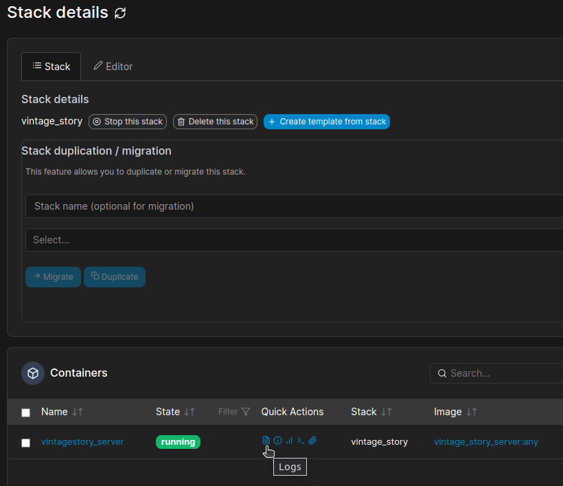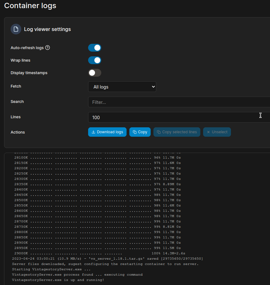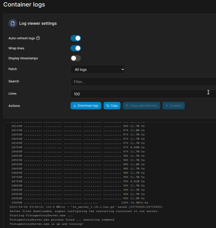 ################## Top Information ################## Disclaimer: I'm fairly new to docker and brand new to VS server hosting, So it is very likely I'm missing something. That said What I have below is working for me so far. Credit: I've based this off of the docker file and launch script that you can see here in snook9's repo (MIT License). My tweaks allow you to set the version you want as an environment variable (in a docker compose for example) as well as make sure the data and server folders are easily accessible on the host system. I will also note I saw Devidian's repo, but did not particularly like the need to wait for them to put out a new container for the next version. This of course means that if the server setup instructions changes for some reason The dockerfile below will need updating. I believe that is a fairly low chance at this point, but it is possible. The way I'm doing it also provides the chance that the user will enter a wrong version number and cause issues, but that is IMO worth the flexibility provided. This is broken into two sections. In the first I'm going to just provide the needed files that any experienced docker user should be able to use. In the second section, I'll give more details on how to set this up via Portainer. ########################## The Files ########################## There are 2 files attached to this post. Dockerfile launcher.sh The dockerfile and launcher.sh go together. You need to make sure the launcher script is accessible when the dockerfile is used to build the container (I do an ADD launcher.sh in the dockerfile). I tag the container as vintage_story_server:any as you can see in the below compose file. Here is the docker compose I use to actually spin up the container. version: "3.9" services: vsserver: image: vintage_story_server:any container_name: vintagestory_server ports: - "42420:42420" volumes: - /path-to-your-data-folder/vintage_story/server:/home/vintagestory/server - /path-to-your-data-folder/vintage_story/data:/var/vintagestory/data environment: - VS_VERSION=1.18.1 You obviously want to set the volume paths to the correct location. You will also want to run chown 1000:1000 on these folders on your host system so the container can access them. You can also update VS_VERSION to any version of vintage story. An important note: the launcher script is what downloads and installs the right vintage story archive. When the container is started the launcher script checks if the ./server.sh exists in the server folder. When it doesn't the script downloads the version indicated in the environment variable then stops the server. On the next run, it will see the file there and run the server. This makes updates very easy, you delete the server folder contents and leave the data folder alone. Update the version environment variable then restart the container and the new server version will be downloaded and use your existing server data. I highly suggest backing up the data folder when you do this to make sure your data isn't corrupted when running the new server version. I've done this once from 1.18.0 to 1.18.1 and it was seamless (though obviously a very minor update). #################### Setup With Portainer #################### This assumes you have the Portainer web interface setup and running. First we need to build the container image. Log into Portainer and Switch to the Local Environment. Go to Images in the side panel. Click on the Build a new Image button. Enter vintage_story_server:any for the name. Select Web Editor (selected by default usually) and enter the full text contents of the Dockerfile file attached to this post, and downloadable from here: Dockerfile Under the box you pasted the Dockerfile into, you will see an option to upload files. Click the Select files button and upload the launcher.sh file attached to this post, and downloadable from here: launcher.sh Once all that is done, go to the very bottom under the Actions section and click Build the image. This can take a while. When it is done the window will automatically switch to a log file viewer. You should see successful in the very last line. If it says error, you will need to figure out what went wrong. You should now be able to go to the Images section and see your new container image in the list there. looking under the tag column you should see the vintage_story_server:any. You now need to actually use the image to create your server. First, You will need to SSH into your server or use whatever method your host provides to create a folder for vintage story. Under this folder you should add a data and server folder. You then need to set these folders ownership to use the user ID and group id 1000. In ssh you would use chown 1000:1000 server then do the same for the data folder. This allows the container to save the server files and data to these folder. Optional: While you are here, it is a good idea to create a serverconfig.json in the data folder that is configured to your needs. If you do not, when the server is run, it will create this file using vintagestory server's defaults which need at least some tweaking by you even if it's just the name and description fields. Second, You should still be logged into Portainer and in your local environment. If not do so now. in the side bar go to Stacks. You will then want to click the Add stack button. Name the stack whatever you want. In the Web Editor section you will want to paste in the below Docker Compose info. Note this uses Yaml formatting, so if you make changes you will need to follow those conventions. version: "3.9" services: vsserver: image: vintage_story_server:any container_name: vintagestory_server ports: - "42420:42420" volumes: - /path-to-your-data-folder/vintage_story/server:/home/vintagestory/server - /path-to-your-data-folder/vintage_story/data:/var/vintagestory/data environment: - VS_VERSION=1.18.1 You need to change the volumes to be paths on your host server that you can access. Yo