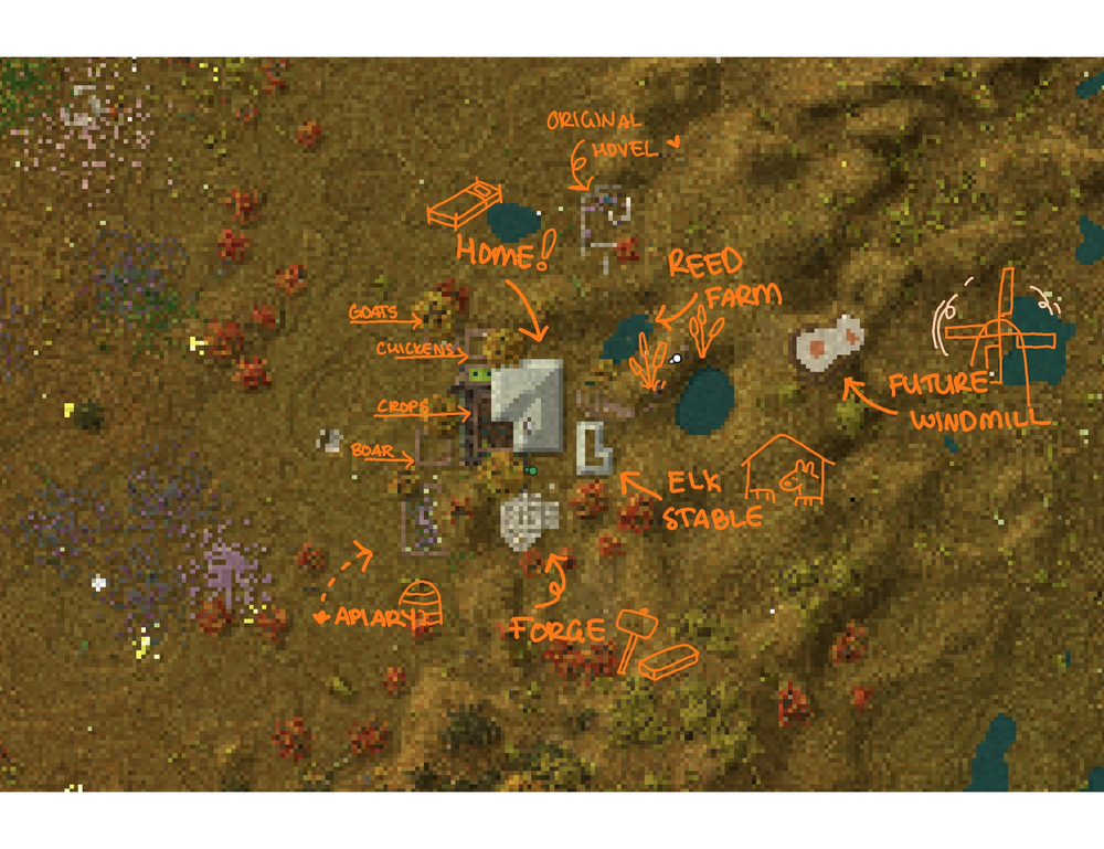 Here's a zoomed out map; from what I understand, people generally have problems finding bauxite and lime just due terrain generation. Much to my chagrin, it is bauxite all the way down anywhere I go in this entire area that's pictured. Bauxite world is granite, limestone, and bauxite for the most part. There's also a lot of hematite, magnetite, olivine, and quartz around me. I've found a couple really large olivine deposits with big crystals inside which I thought were super cool! And some massive quartz deposits with rich and bountiful silver and gold as well. Despite the insane amount of bauxite though, I've never found naturally generated fire clay, I've had to craft all of my fire clay from red/blue clay T_T... I've stayed very close to my natural spawn and don't really have any plans atm of moving since it's definitely nice being near bauxite and limestone, but I would like to make a winter home much further south towards the equator. I considered moving during the first winter in my world because it seemed like it went on forever, and I'm ngl the extremely short days started getting on my nerves since it's very difficult to travel in the dark and I'm definitely an explorer! I'll probably try to fill this coming winter (currently fall in-game) with projects near home, like chiseling more details and furniture around the base, stocking up on charcoal, smithing, starting construction on my steel refractory, playing around with automation/mechanization, etc. Pretty zoomed-in look at what's currently happening around my house :3 I definitely prefer having more densely packed/decorated areas that are on a smaller scale than having like a large property/base area with space between everything. That being said, the biggest expansion to date is the windmill I'm working on >_<;; I don't know anything about mechanization, I was never interested in minecraft mods that had automation and mechanization upgrades and I don't typically enjoy games like Satisfactory or Factorio that are dependent on mechanization/automation. I've been hammering out all my steel by hand and grinding my quern by hand for the last 110 hours and I honestly would have kept it that way if I didn't need a windmill to advance to steel. However! It seems pretty intuitive and I'm not annoyed or criticizing the fact a windmill is required to progress, I'm having fun building the windmill itself and I'm excited to get it up and running ^_^!! You may notice that my elk is in fact ... Not... in his stable. I put him in there when we come home but I always leave the gate open because I don't mind him wandering around and I think it's funny to see where he goes to take naps etc. He really likes to sleep next to my boars for some reason, I think they're all friends :3 My farm/crop area is also pretty small because once you have a cellar set up, you don't really need that much food to make it through a year comfortably, and even then I know I won't be able to eat it all despite the limited harvest. Soybeans are definitely a game changer for me for the winter and being able to get enough protein, but I still have never had any dairy, as the only two goats that came down from the mountains last winter were both male T_T... I've kept both of them but I'm hoping to find a female close to base this coming winter to finally start making cheese. I did recently accidentally kill my only rooster (oops) so the chicken breeding has come to a halt, which is fine by me as I really just want their eggs anyway. And I'm currently on generation 1 of my boars, with mama pregnant with gen 2 currently. Generation 0 I caught in early spring iirc near the Boar Hot Springs, who have tragically been slaughtered already once I confirmed at least 1 sow and 1 boar was born from their first litter.