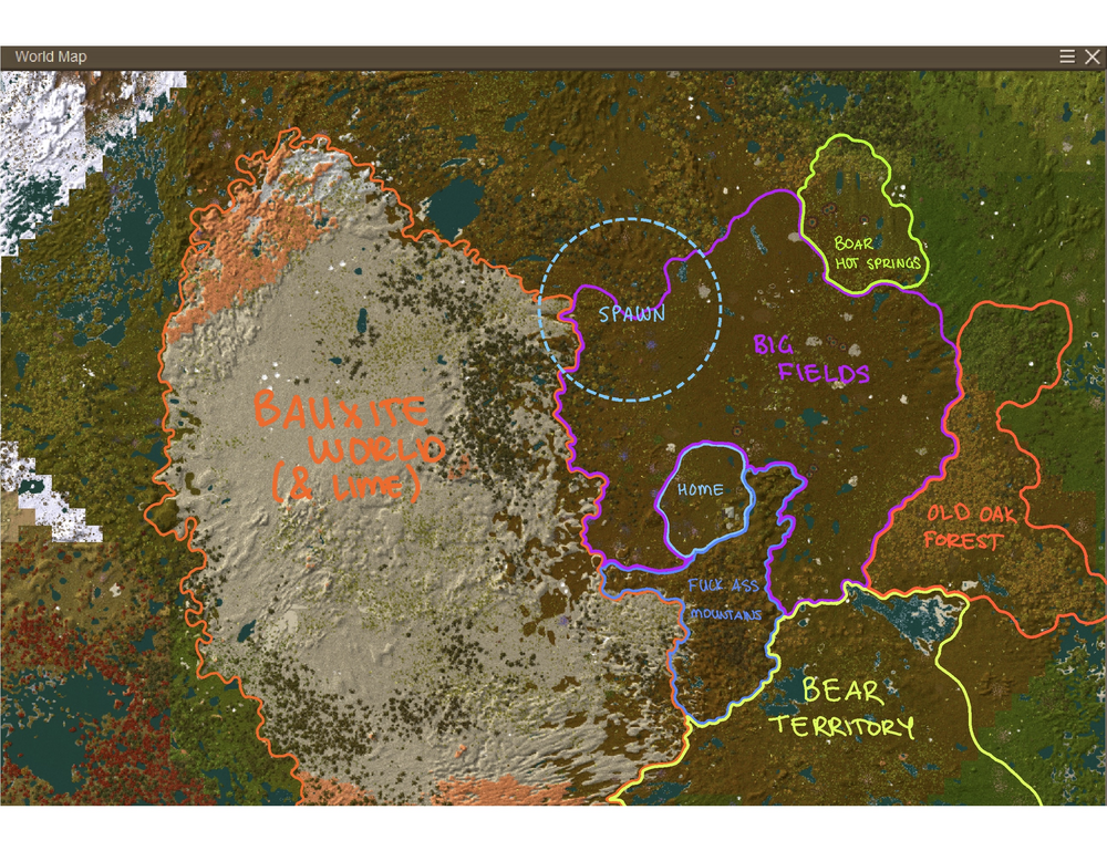 Here's a zoomed out map; from what I understand, people generally have problems finding bauxite and lime just due terrain generation. Much to my chagrin, it is bauxite all the way down anywhere I go in this entire area that's pictured. Bauxite world is granite, limestone, and bauxite for the most part. There's also a lot of hematite, magnetite, olivine, and quartz around me. I've found a couple really large olivine deposits with big crystals inside which I thought were super cool! And some massive quartz deposits with rich and bountiful silver and gold as well. Despite the insane amount of bauxite though, I've never found naturally generated fire clay, I've had to craft all of my fire clay from red/blue clay T_T... I've stayed very close to my natural spawn and don't really have any plans atm of moving since it's definitely nice being near bauxite and limestone, but I would like to make a winter home much further south towards the equator. I considered moving during the first winter in my world because it seemed like it went on forever, and I'm ngl the extremely short days started getting on my nerves since it's very difficult to travel in the dark and I'm definitely an explorer! I'll probably try to fill this coming winter (currently fall in-game) with projects near home, like chiseling more details and furniture around the base, stocking up on charcoal, smithing, starting construction on my steel refractory, playing around with automation/mechanization, etc. Pretty zoomed-in look at what's currently happening around my house :3 I definitely prefer having more densely packed/decorated areas that are on a smaller scale than having like a large property/base area with space between everything. That being said, the biggest expansion to date is the windmill I'm working on >_<;; I don't know anything about mechanization, I was never interested in minecraft mods that had automation and mechanization upgrades and I don't typically enjoy games like Satisfactory or Factorio that are dependent on mechanization/automation. I've been hammering out all my steel by hand and grinding my quern by hand for the last 110 hours and I honestly would have kept it that way if I didn't need a windmill to advance to steel. However! It seems pretty intuitive and I'm not annoyed or criticizing the fact a windmill is required to progress, I'm having fun building the windmill itself and I'm excited to get it up and running ^_^!! You may notice that my elk is in fact ... Not... in his stable. I put him in there when we come home but I always leave the gate open because I don't mind him wandering around and I think it's funny to see where he goes to take naps etc. He really likes to sleep next to my boars for some reason, I think they're all friends :3 My farm/crop area is also pretty small because once you have a cellar set up, you don't really need that much food to make it through a year comfortably, and even then I know I won't be able to eat it all despite the limited harvest. Soybeans are definitely a game changer for me for the winter and being able to get enough protein, but I still have never had any dairy, as the only two goats that came down from the mountains last winter were both male T_T... I've kept both of them but I'm hoping to find a female close to base this coming winter to finally start making cheese. I did recently accidentally kill my only rooster (oops) so the chicken breeding has come to a halt, which is fine by me as I really just want their eggs anyway. And I'm currently on generation 1 of my boars, with mama pregnant with gen 2 currently. Generation 0 I caught in early spring iirc near the Boar Hot Springs, who have tragically been slaughtered already once I confirmed at least 1 sow and 1 boar was born from their first litter.