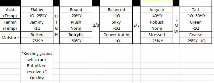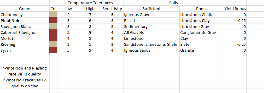 This is another post about a way to create 'geolocked resources' - valuable resources which could only can be cultivated in specific spots and would necessitate the building of additional infrastructure to extract and transport those resources. It's a suggestion that's aimed at providing a reason to continue playing. When exploring the tropics, I covered incense-bearing trees, spices, and coffee. For temperate areas, I'm going to focus on a greatly expanded system for winemaking which will cause players to look at the lay of the land and the different soil profiles in a completely different way. Grape Vines In the real world, wine grapes are a very unique crop. They respond poorly to rich, fertile soil, often providing thin, unimpressive wines in great quantities. This means that they are often planted on soils which wouldn't be used to produce other crops, like sands, gravels, or slopes with thin clay soils over bedrock. One of the great things about Vintage Story is that it already tracks the temperature of each block and uses this to determine heat stress in crops to determine reduced yields. Because of this, I think that a very rich, immersive system for winegrowing could be implemented fairly easily. The central crop for this system would be the grape vine. These would be trained on a trellis made of sticks and boards, and could be stacked two high, with a similar mechanic to bushes. However, they would bear fruit as a fruit tree does, going through stages of flowering, fruit set, and ripening. They could be planted on gravel, sand, or clay, which would introduce an incentive to maintain these otherwise extraction-focused resources. There would be no need to manage nutrients as we do in farmland - heavy fertilizing is typically not beneficial to wine grapes. This land could be worked with a hoe in order to create a vineyard row before installing the trellising and planting the vine. Vine cuttings could be gained by using shears on the second level of trellising, removing its ability to yield grapes for one year but providing you with a number of cuttings with which to expand your vineyard. There would be seven different grape varieties with different levels of heat and cold tolerance and preferred growing conditions. Depending on the level of heat stress which the vine endures, the final yield would be affected. What's more, each grape harvested will also have a quality level which determines both the value of a given wine and it's ability to age in a cellar, increasing the quality level by a given percentage each year until it reaches the end of its shelf life. Here are the different grape varieties. They would receive +1 quality for being planted on their bonus soil type. Pinot Noir and Riesling would have narrower temperature tolerances and lower yields, but would be rewarded with an additional +1 quality. As the grape vines grow, they will pick up conditions based on temperature and moisture variations. The temperature tolerances would have to be tinkered with, and my values are really just there to show where they would stand relative to one another. Growing Conditions As the year passed, each grape vine would pick up conditions, similar to how a crop would, and yields/quality would be reduced or increased depending on which conditions had been picked up during the growing season. This would cause differences not only from vintage to vintage, but also from site to site, as temperature and rainfall would vary with elevation and latitude. Acidity In the real world, acidity is very important for both red and white wines, and is largely determined by the temperature of the grapes throughout the growing season. Lower temperatures lead to higher acidity, while warmer temperatures cause the fruits to metabolize acids and break them down. This could result in five different harvest conditions for both reds and whites: flabby, round, balanced, angular, or tart. Tannins Tannins are almost entirely a concern for red grapes in the real world and would only concern them in Vintage Story (this is why normal quality white grapes were given a wider temperature tolerance - they can't get extra quality from tannins and would be pointless without being given an edge through that means). While red grapes are less forgiving temperature wise, they have the ability to pick up an extra quality point in the right environs. The different harvest conditions would be jammy, plush, silky, robust, and green, and would only affect quality, not yield. Moisture Moisture is important in the real world for wine grapes. Too much can cause rot, too little can cause hydric stress. This parameter would effect all grapes equally, they would not have individual tolerances. Too much moisture would cause heavily reduced yields, while too little would slightly reduce yields and quality. There is a grey rot which affects the berries, caused by the fungus Botrytis cinerea. In most cases it is undesirable and causes grey rot, dramatically reducing yields. But for one grape in our seven, Riesling, if kept in check this fungus creates noble rot, producing concentrated Sélection de Grains Nobles or Trockenbeerenenauslese wines which are highly sought after in small quantities. In order to balance the extra quality points that Pinot Noir can pick up from clay soils and tannins, Riesling which reaches this point without rotting will receive 1/2 yields but a huge bonus to quality. The five conditions would be rotted, botrytized, concentrated, stressed, and coarse. Proper water balance will require carefully thought-out irrigation and not planting in areas with too much or too little rain. Calculations The way these would be calculated would be to add all of the quality bonuses, while the yield ones would be added one after another. For example, an angular, robust, stressed red would have it's base yield, lets say it's 100 for ease of calculation, be cut by 40% to 60, then by 25% to 45, not by 65% to 35. A tart, concentrated whit